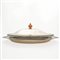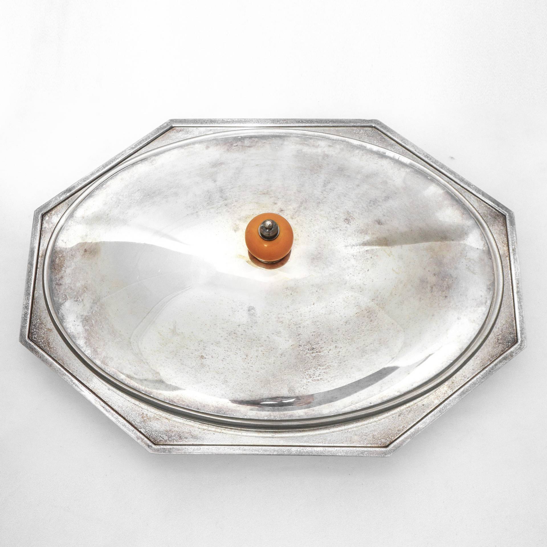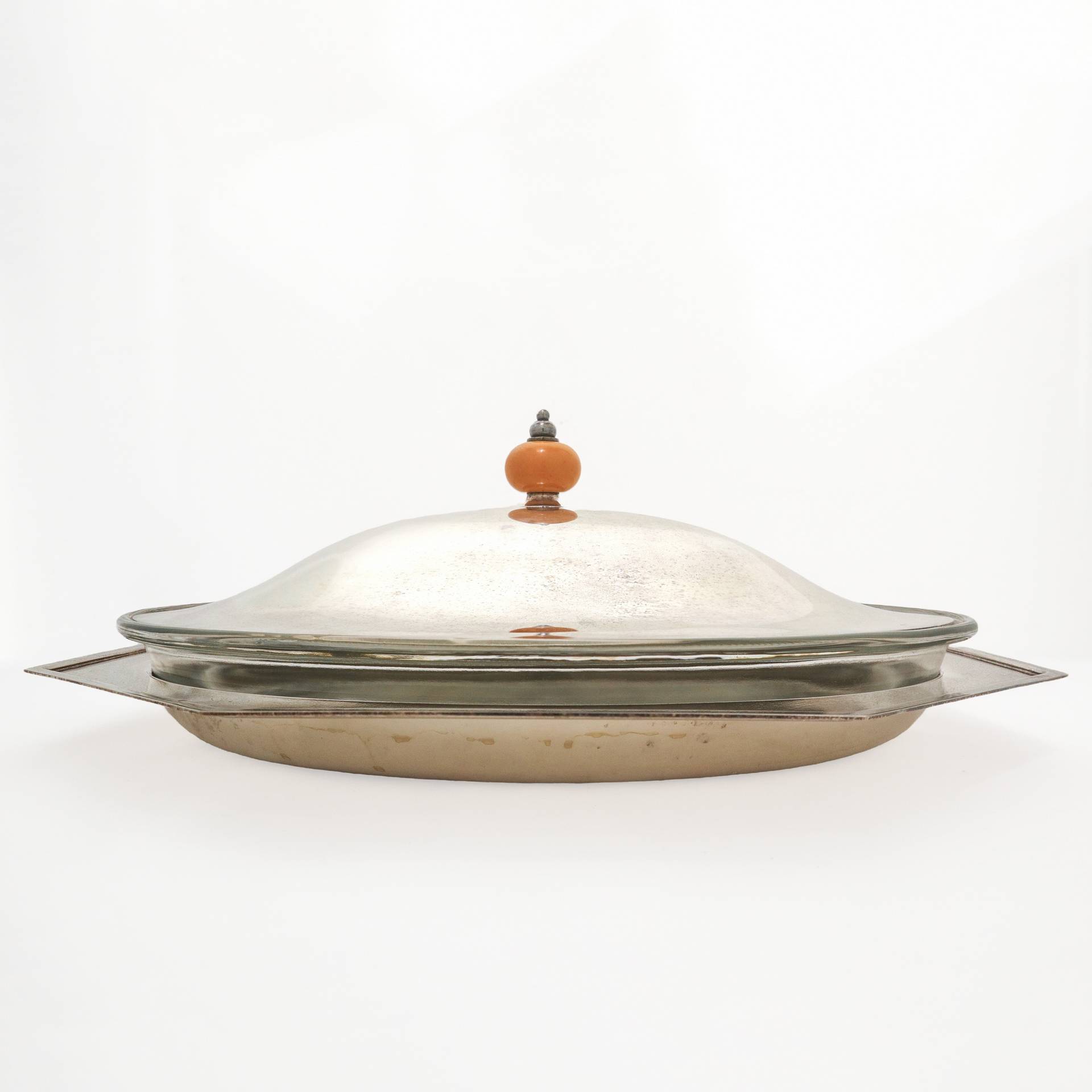 Pirofila ovale in sheffield con pyrex all'interno e presa gialla sul coperchio h cm 5X40
