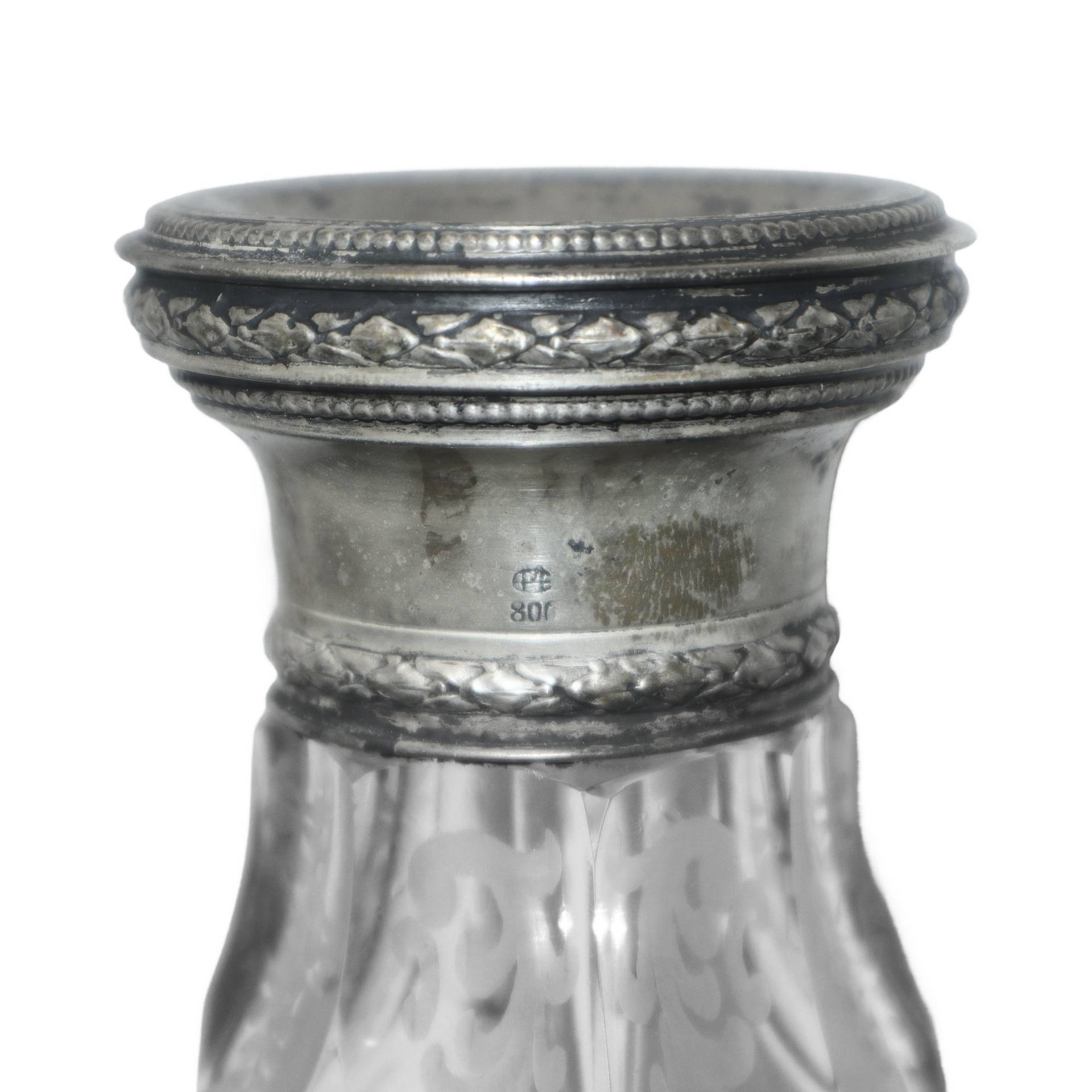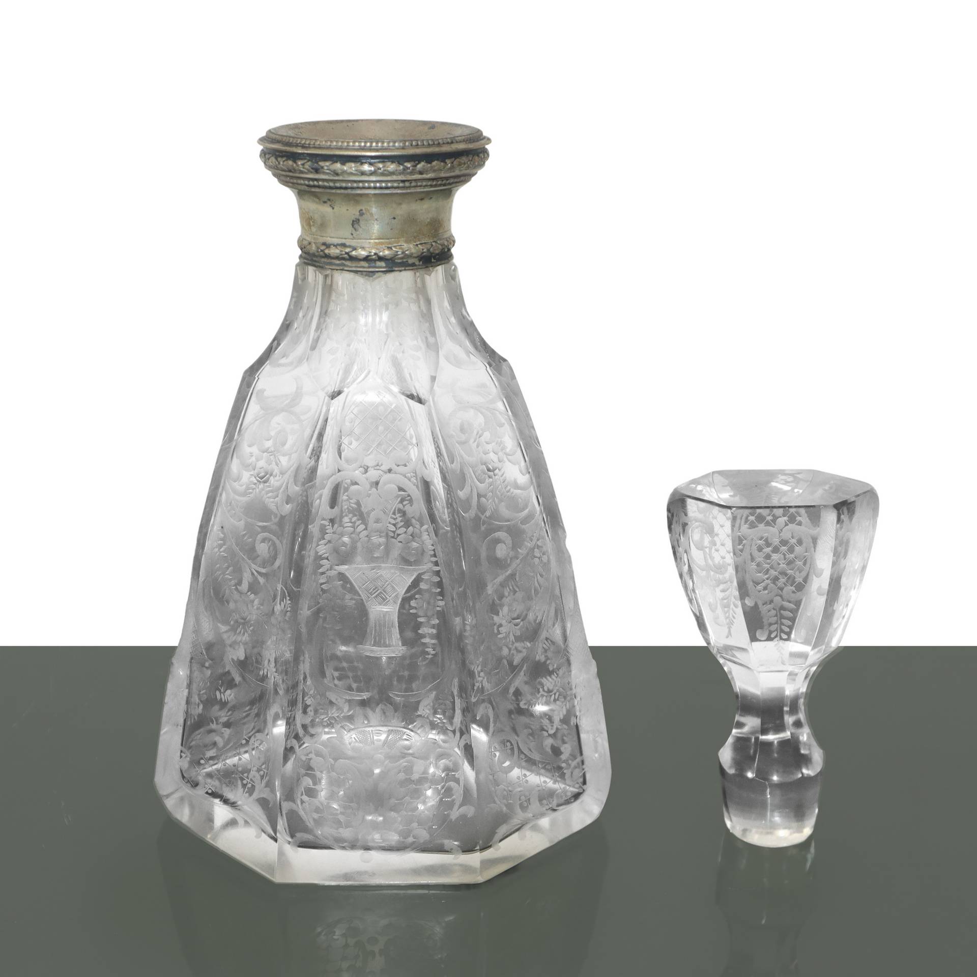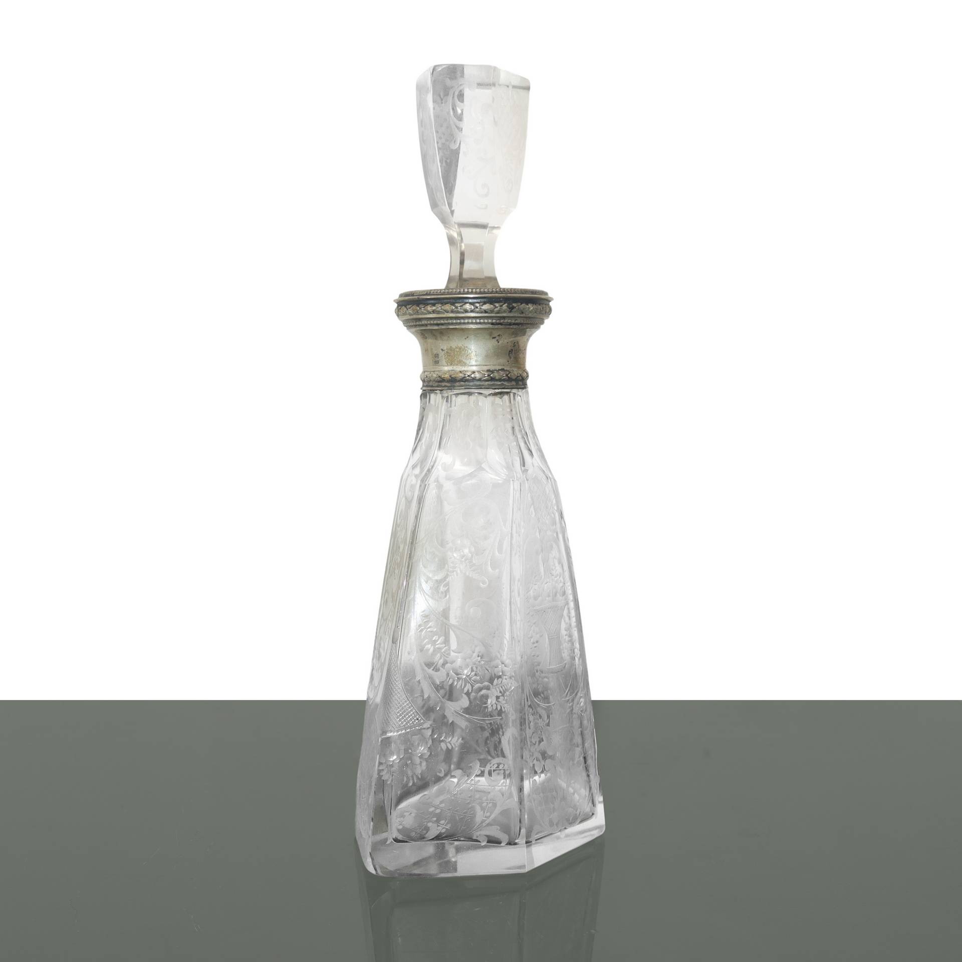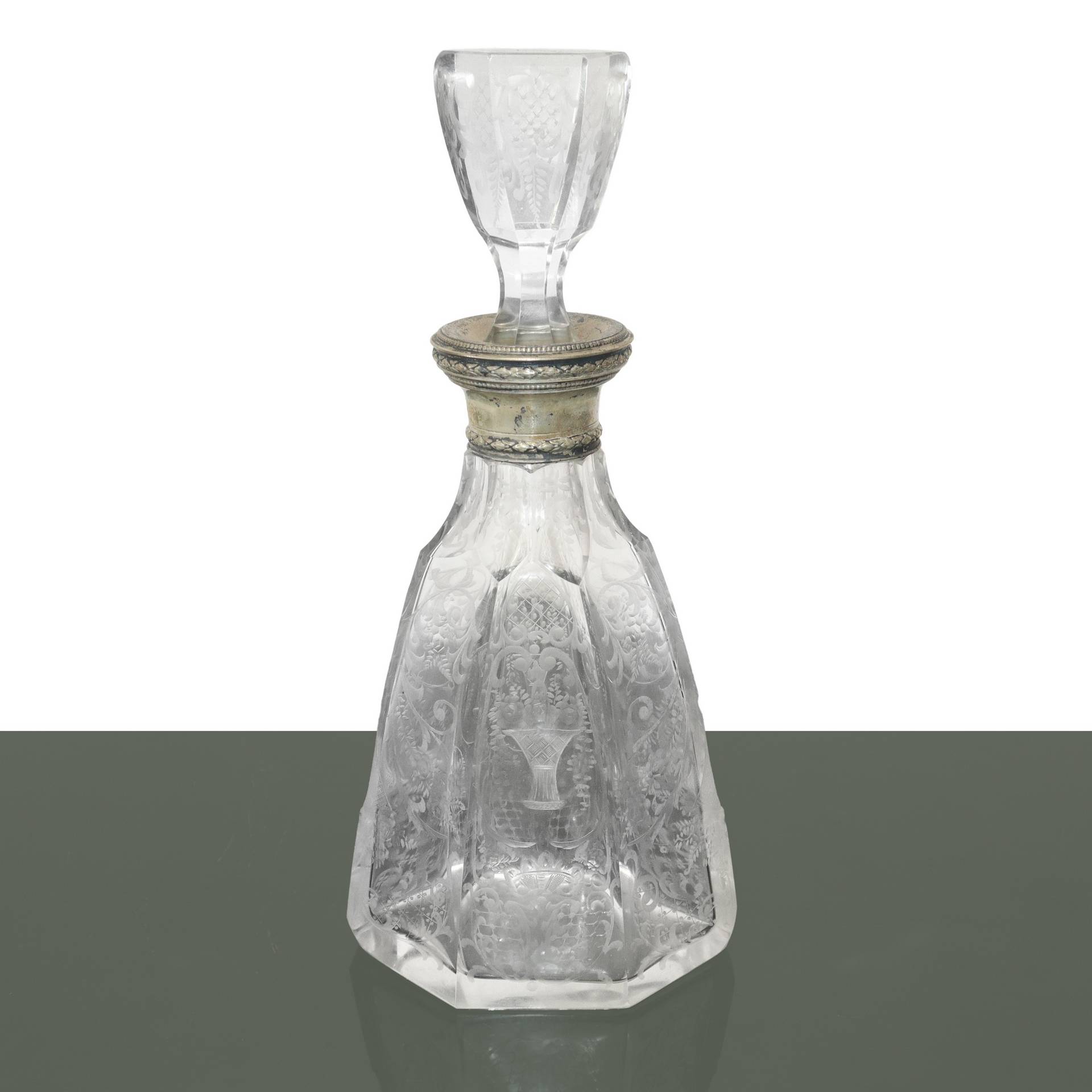 Bottiglia in cristallo decorato con fiori e bordo in argento 800