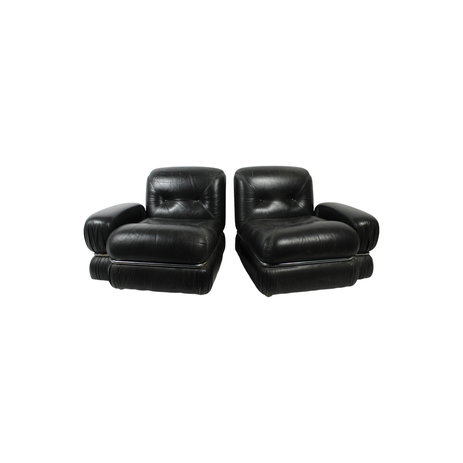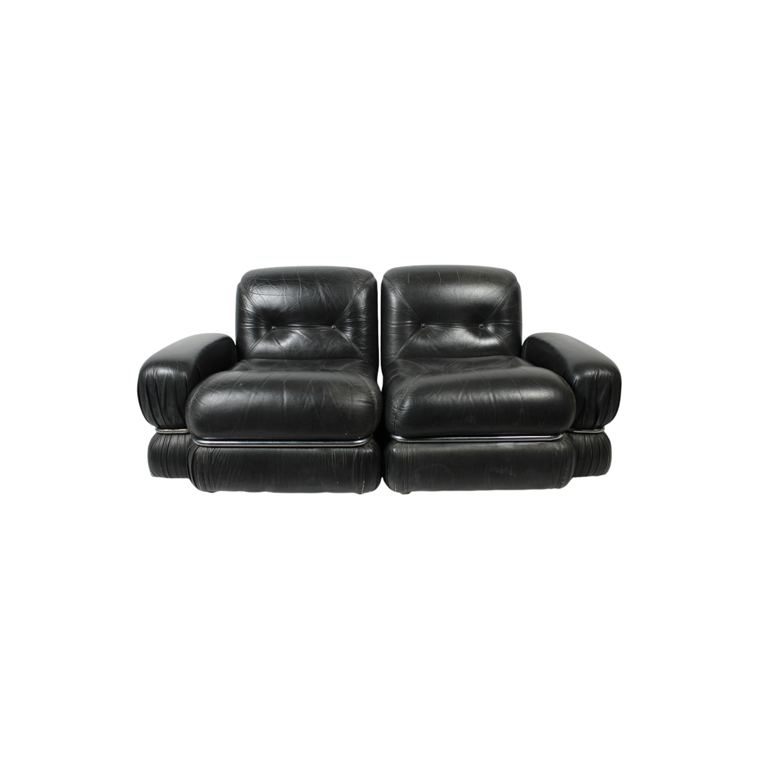 SET COMPOSTO DA due poltrone in pelle nera e struttura in acciaio produzione italiana anni 70 h cm 64 x 156 x 84