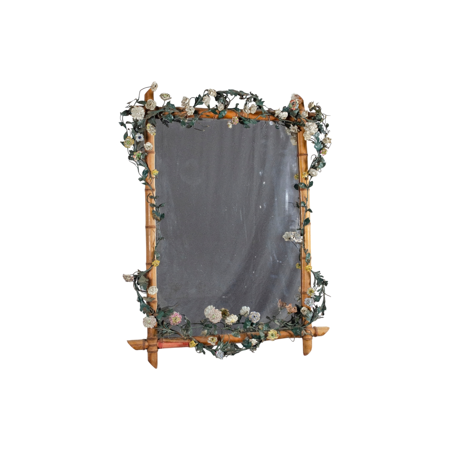 SPECCHIO in bambu' con decoro floreale in metallo produzione italiana periodo stimato anni 60, difetti h cm 97 x 75