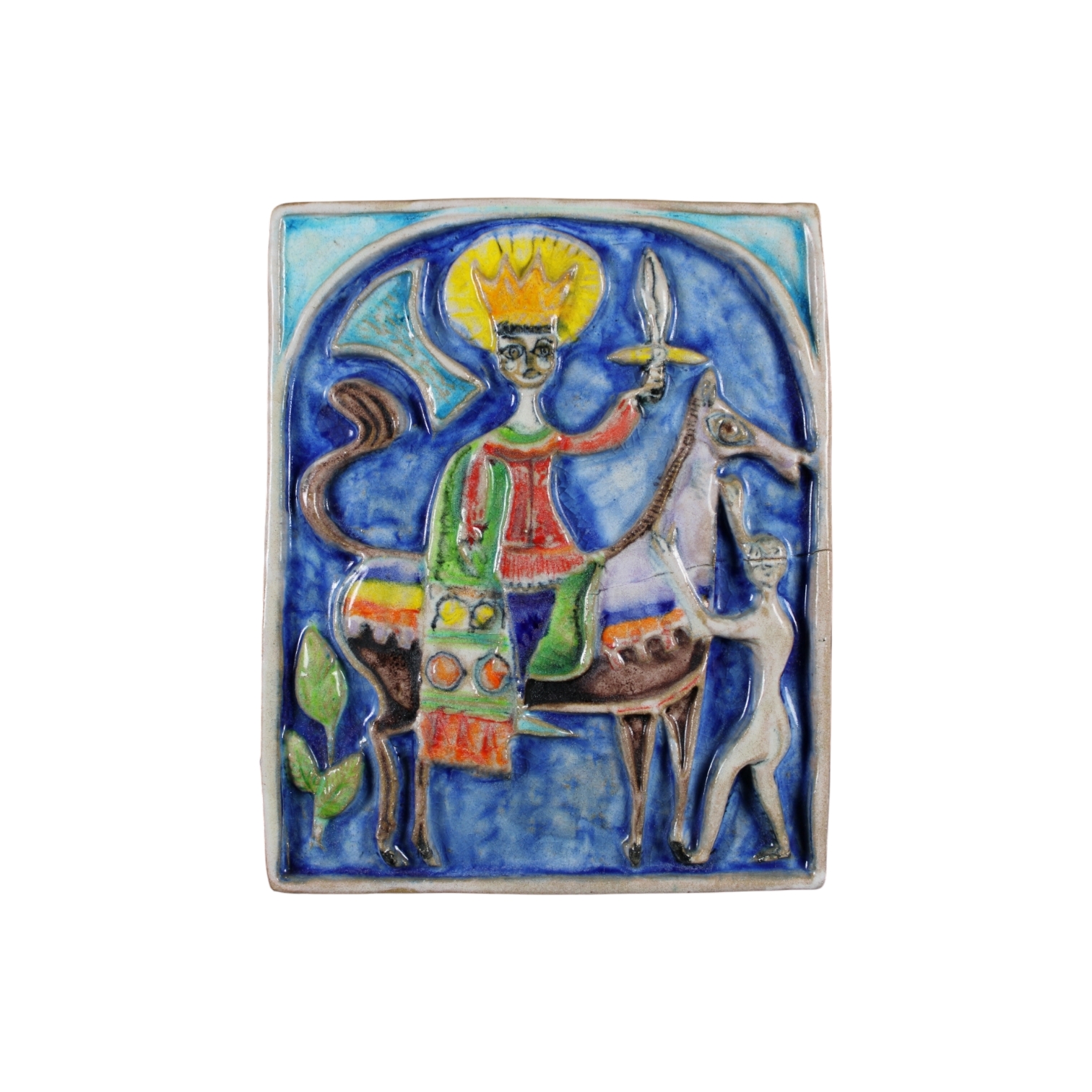 PLACCA in maiolica invetriata raffigurante Re Ruggero manifattura Giovanni De Simone , lesione nella parte centrale e vecchio restauro Sicilia XX secolo h cm 35 x 29