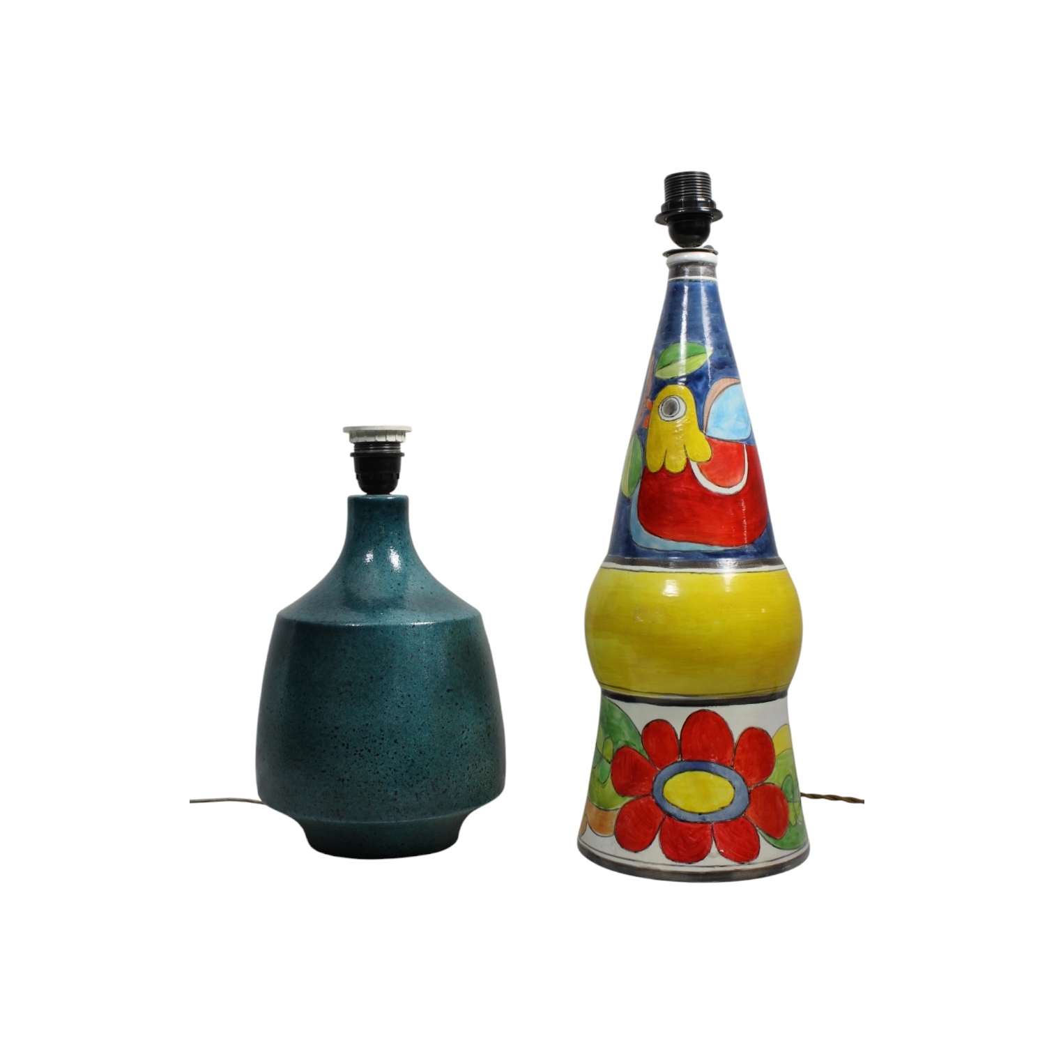 LOTTO COMPOSTO DA 2 lumi di cui uno in maiolica Nino Parrucca (rotture e parti incollate) ed 1 in terracotta invetriata nei toni del blu Sicilia XX secolo h cm 57 x 21 / h cm 37 x 22