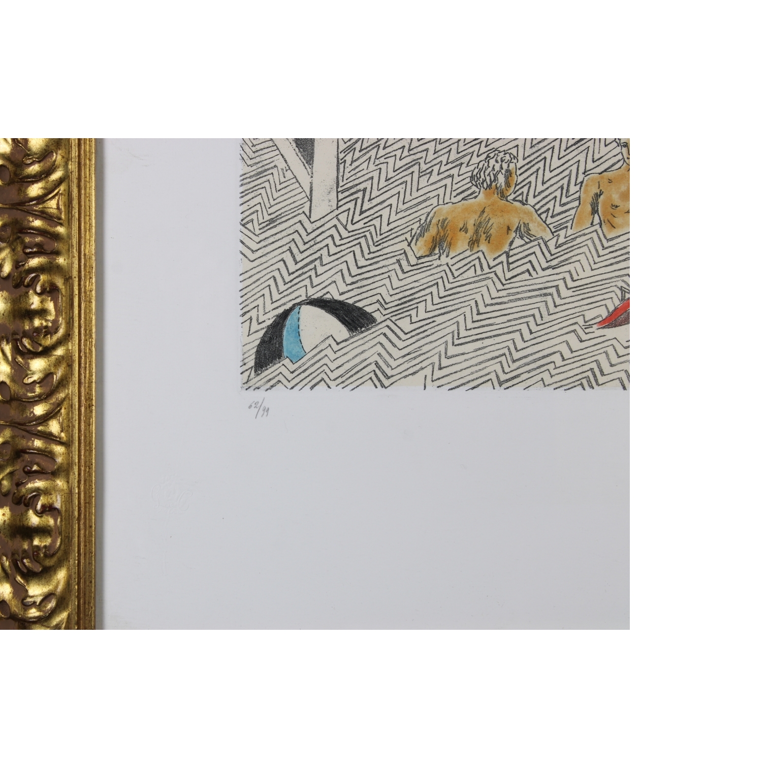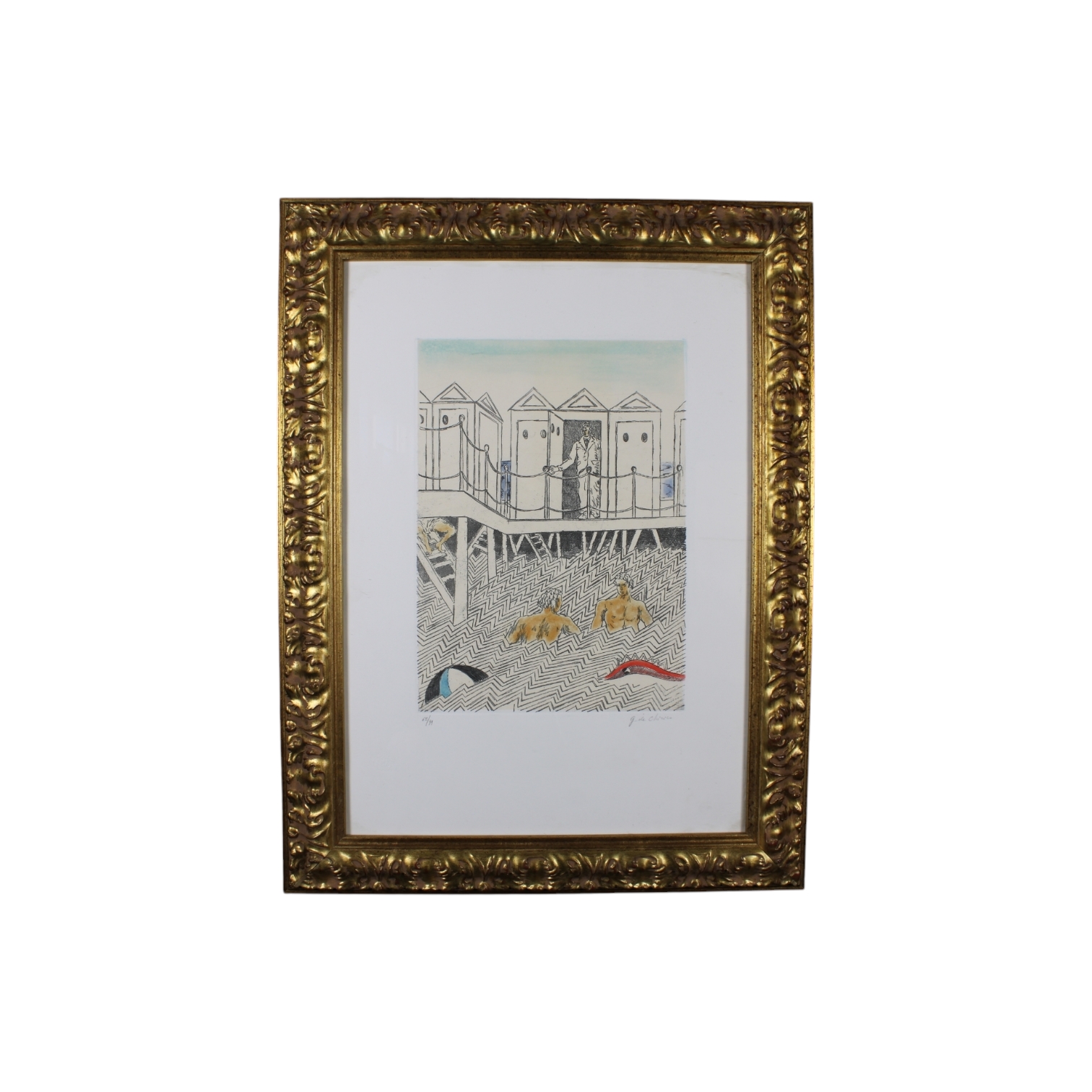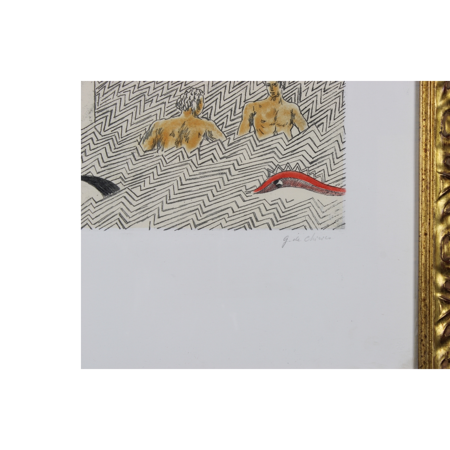 G. DE CHIRICO P. A. litografia colorata a mano "conversazione nei bagni" 1973.. Roma firma a matita . doppio timbro a secco ED. ALBERTO CAPRINI. dentro cornice in legno h cm 70 x 50