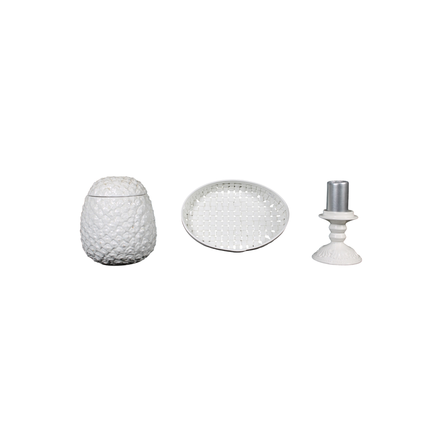 SET COMPOSTO DA 3 oggetti in maiolica invetriata di colore bianco di cui un piatto, un candeliere monocera e un vasetto con coperchio produzione italiana anni 2000 misure varie