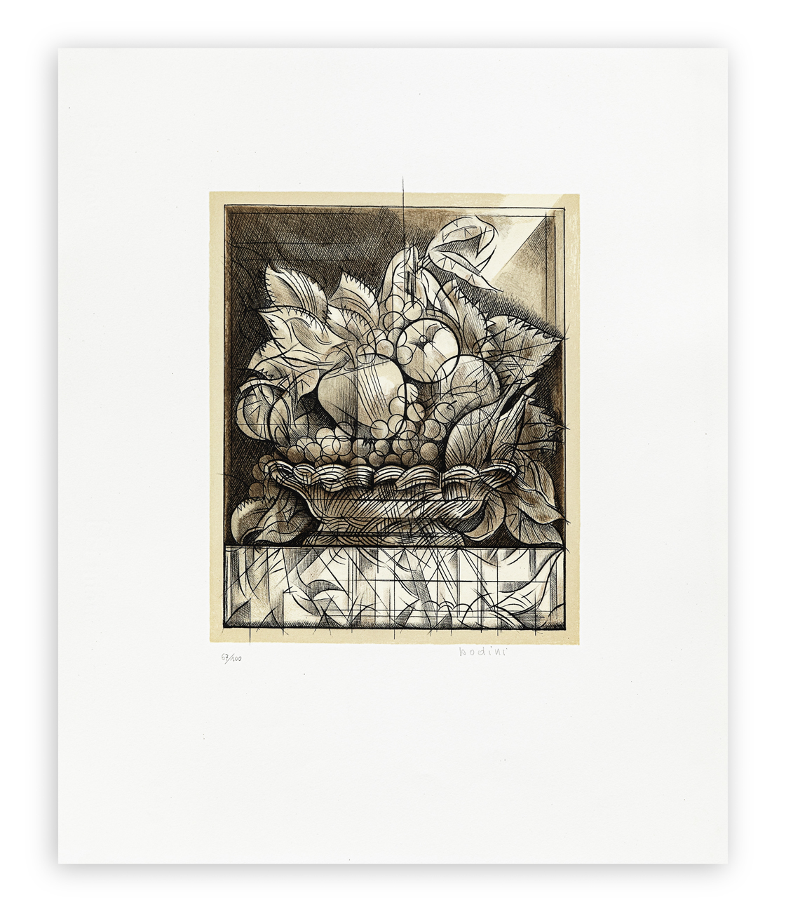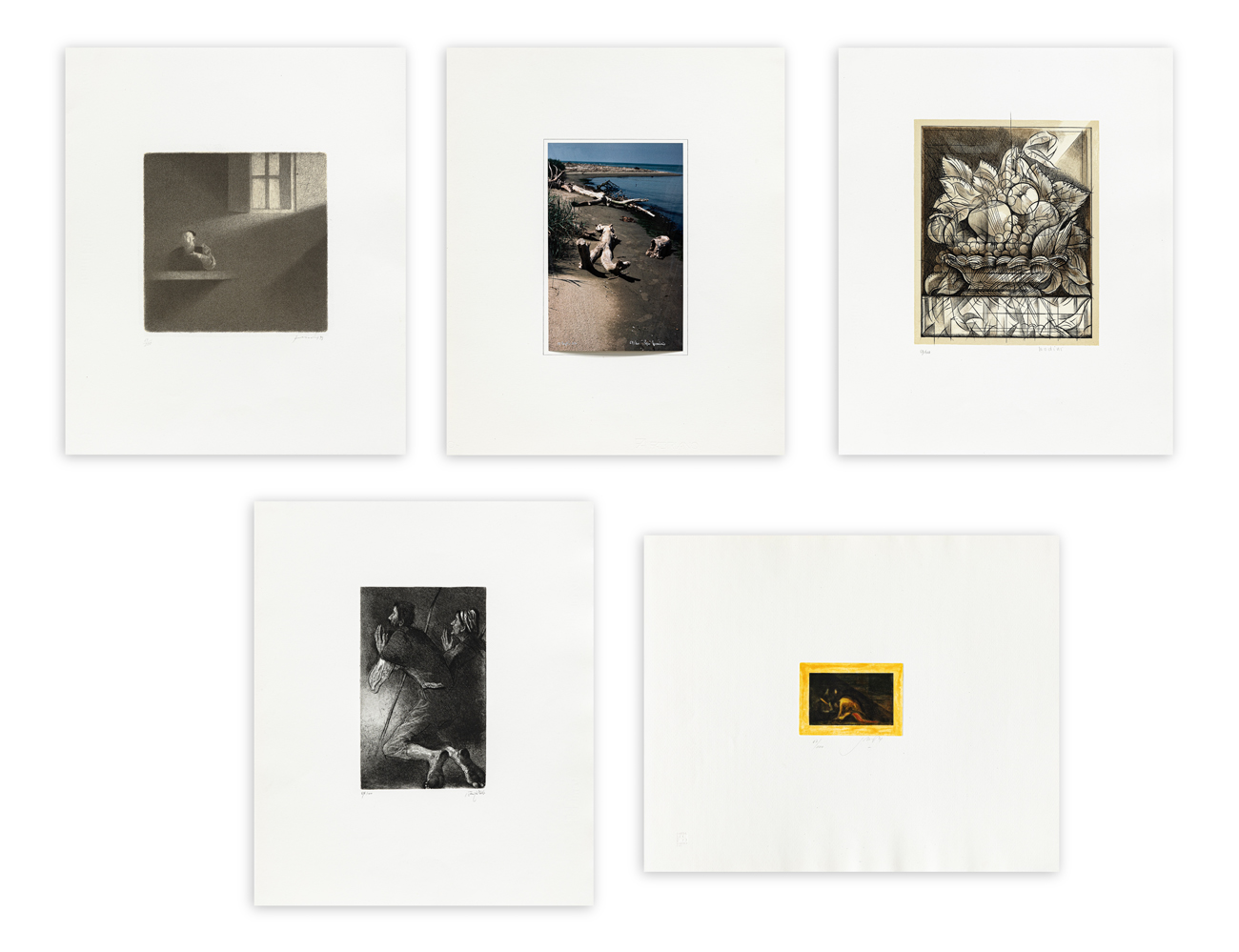 Lotto unico composto da una litografia di Floriano Bodini, una litografia di Gianfranco Ferroni, un'acquatinta e puntasecca di Piero Guccione, una fotografia di Pepi Merisio e un'acquaforte e acquatinta di Giancarlo Vitali