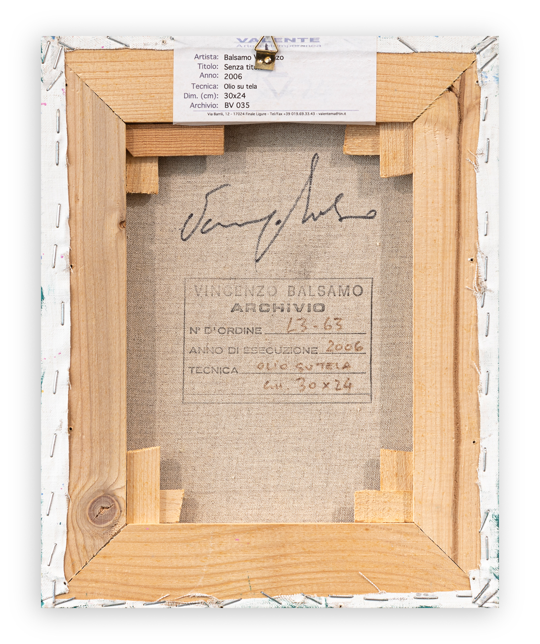 Etichetta della Galleria Valente Arte Contemporanea (SV) al retro