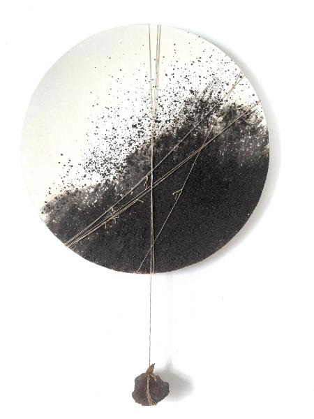 Polvere vulcanica su legno, corda, pietra vulcanica, tempera e foglia oro su carta.