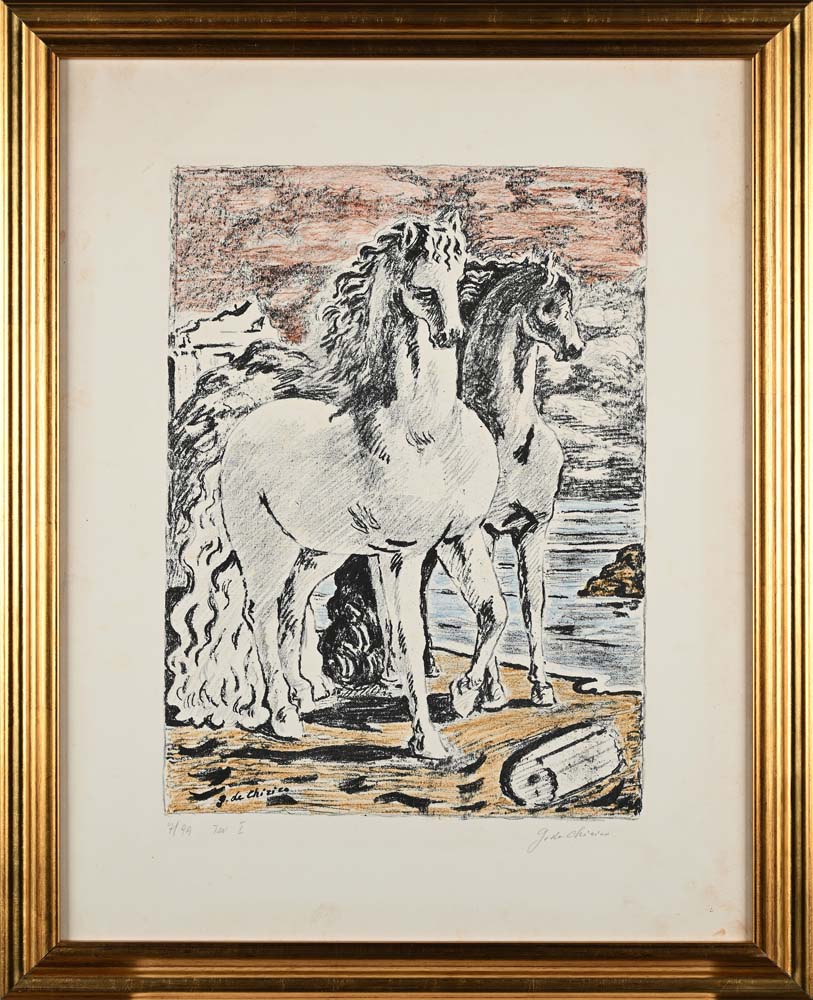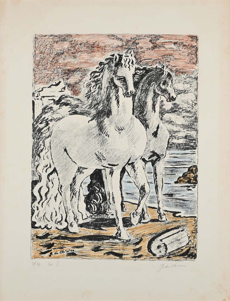 Giorgio De Chirico Volo 1888-Roma 1978 Cavalli Antichi 1966 Litografia cm 64x50 - in cornice cm 71x58 Firma e numerazione "G. De Chirico 7/99 tav. 1" Giorgio De Chirico, Catalogo dell'opera Grafica 1921-1969 Edizioni Bora, pag. 225 n. 147