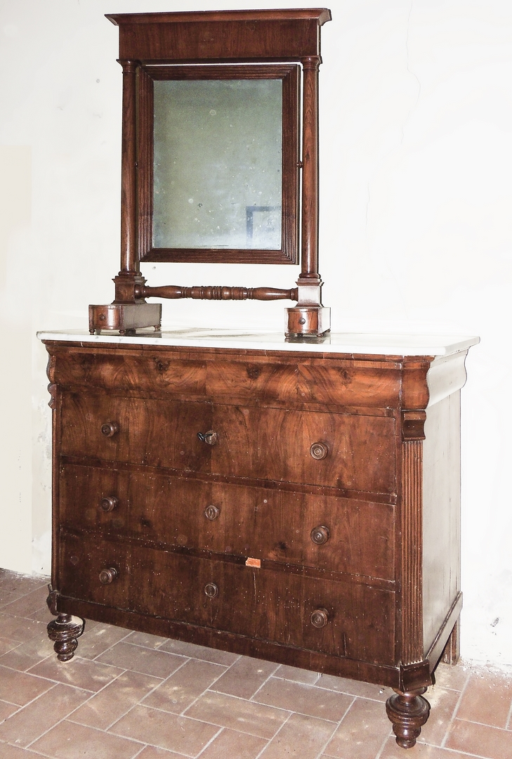CASSETTONE IMPIALLACCIATO IN PIUMA DI NOCE fine del XIX secolo piano in marmo, un cassetto modanato nella fascia, tre cassetti sottostanti, angoli scantonati con lesene scanalate, piedi a trottola, difetti h cm 110x133x61,5