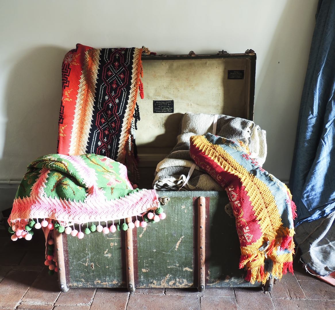 LOTTO DI COPERTE IN LANA tra cui alcune d'epoca, contenute entro baule
