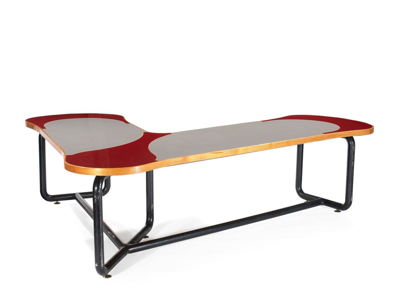 Ta volo Usa, 1960 Struttura in tubolare di acciaio, piano in legno rivestito in laminato ad intarsio su reticolo, fascia in frassino cm 78 h x 280+232 x 78