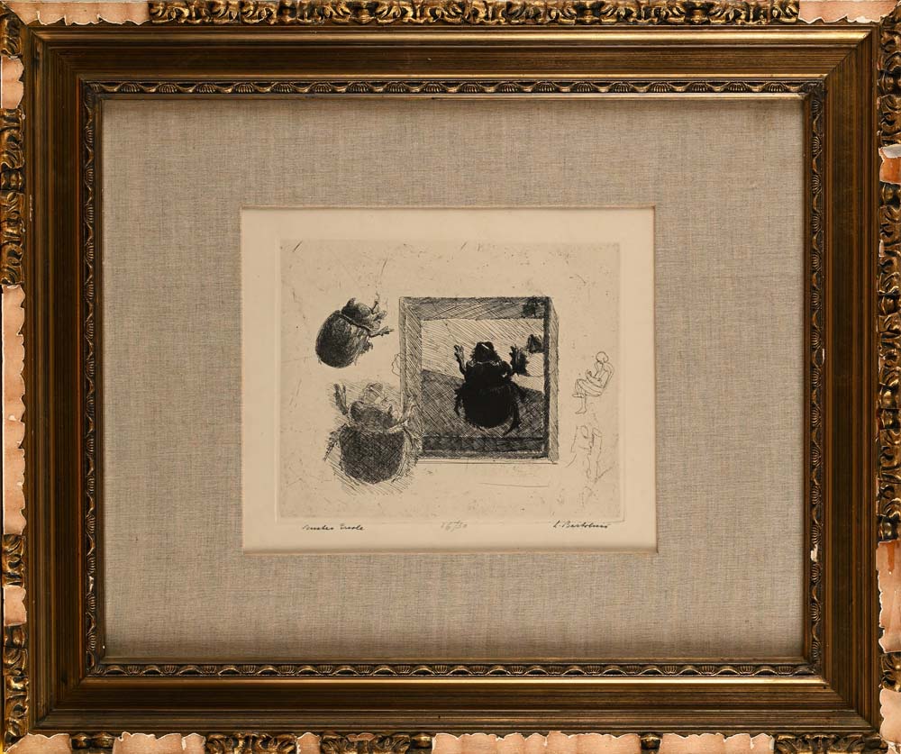 Luigi Bartolini Cupramontana 1892-Roma 1963 Scarabeo Ercole 1934/35 Incisione cm lastra 24x28,5 - in cornice cm 62x72 Firma, titolo e numerazione "Luigi Bartolini, 16/50, Scarabeo Ercole". Al verso etichetta della Galleria Il Castello