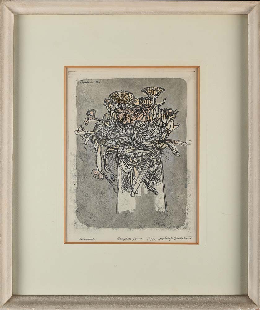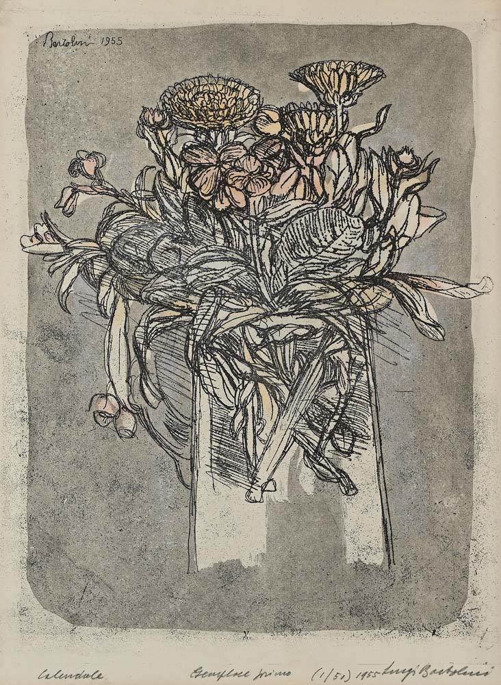 Luigi Bartolini Cupramontana 1892-Roma 1963 Calendule 1955 Incisione acquarellata cm 33x25 (lastra) - in cornice cm 60x51 Firma, titolo, data e numerazione "Luigi Bartolini esemplare primo 1/50". Firma e data in latra