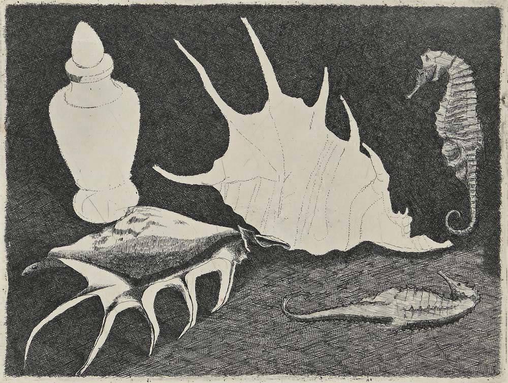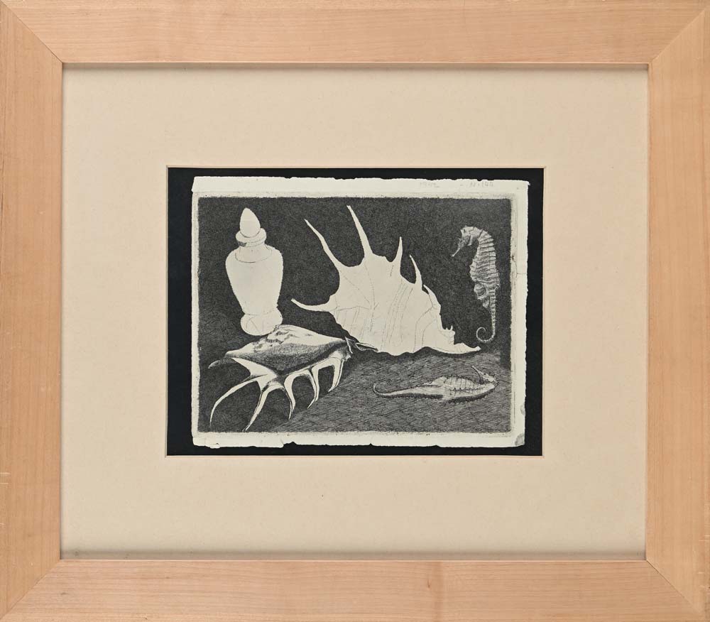 Lino Bianchi Barriviera Montebelluna 1906-Roma 1985 Conchiglie e cavalluccio marino Incisione cm 20x25 - in cornice cm 46x53