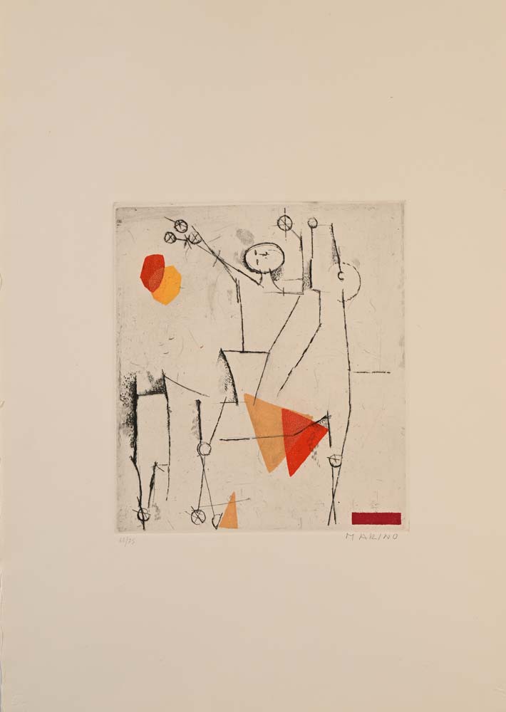 9) I Giochi, Puntasecca Acquatinta a 3 colori, Lastra cm 29x31. Firma e numerazione "Marino 63/75". Timbro a secco dello stampatore "Il cigno stamperia d'arte".
