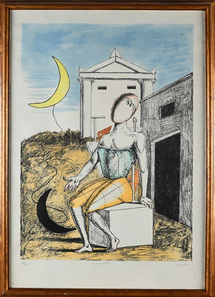 Giorgio De Chirico Volo 1888-Roma 1978 Il poeta solitario Litografia cm 100x70 - in cornice cm 107x77 Firma, titolo e numerazione "G. De Chirico 12/60". Due timbri a secco"Giorgio De Chirico"