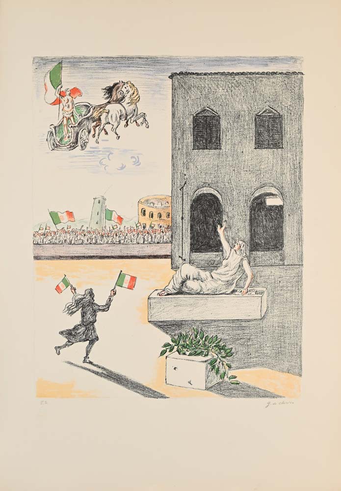 Giorgio De Chirico Volo 1888-Roma 1978 L'Italia del centenario 1971 Litografia cm 100x70 Firma e numerazione "G. De Chirico p.a." Timbro a secco "Giorgio De Chirico" e "Alberto Caprini stampatore in Roma".