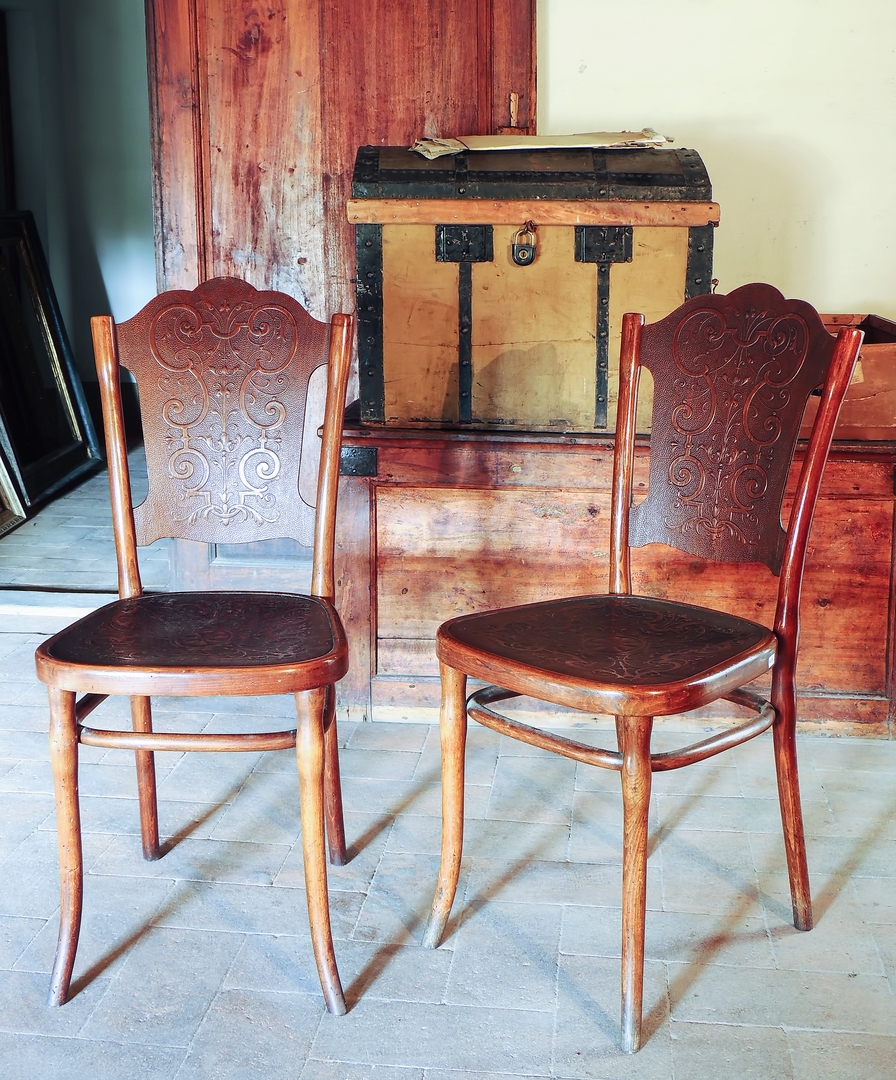 SERIE DI QUATTRO SEDIE IN FAGGIO CURVATO inizio del XX secolo schienale e seduta decorate con volute grottesche
