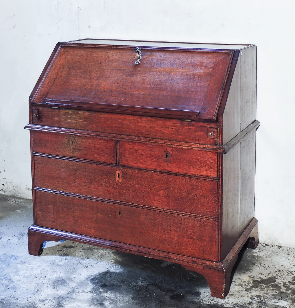 PICCOLA RIBALTA IN ROVERE sportello a calatoio a celare scarabattolo con cassettini e vani, fronte a due mezzi cassetti e due cassetti sottostanti, piedi a mensola h cm 103x91x54