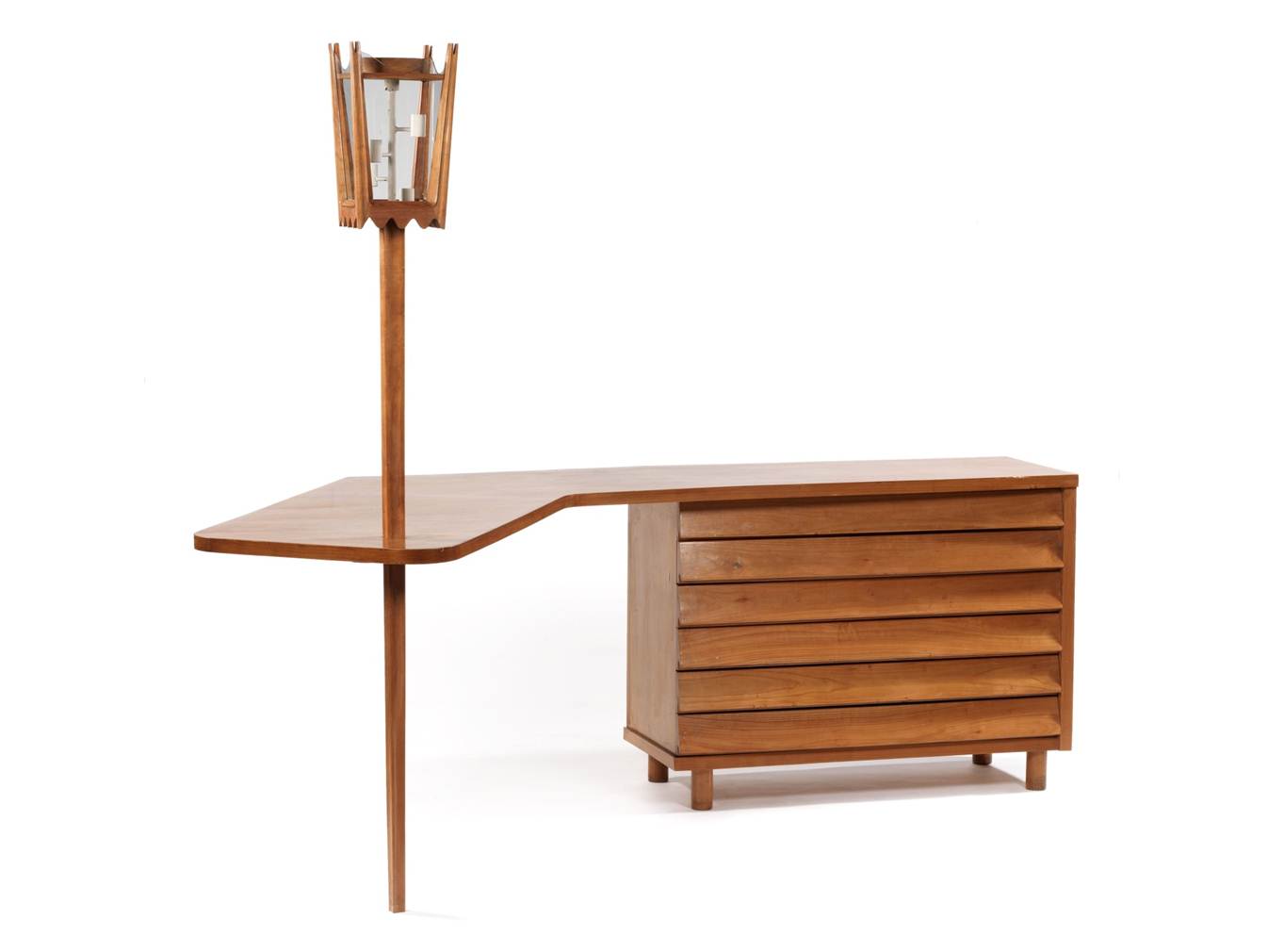 Scrivania con lampione Italia, 1950 Mobile in noce, supporto delle lampade in metallo scrivania: cm 77 h x 230 x 60 lampione: cm 180 h