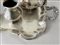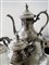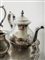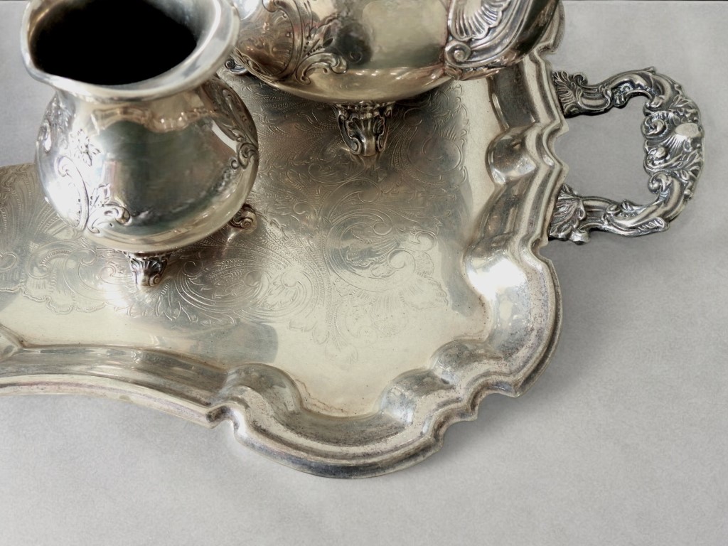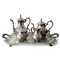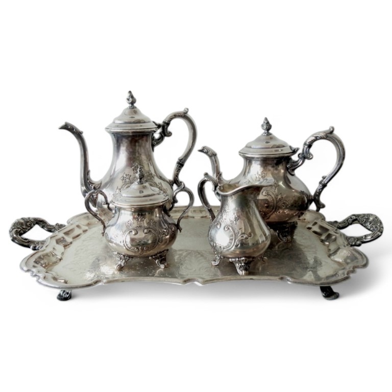 in metallo argentato e cesellato a motivi vegetali composto da caffettiera, teiera, zuccheriera e lattiera, completo di vassoio sagomato e cesellato, di altra manifattura.