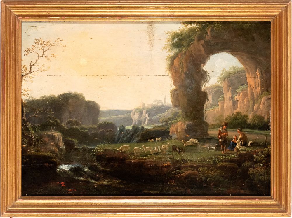 Lotto 192 | Artista attivo a Roma, XVIII secolo Paesaggio con arco di roccia, pastori e...