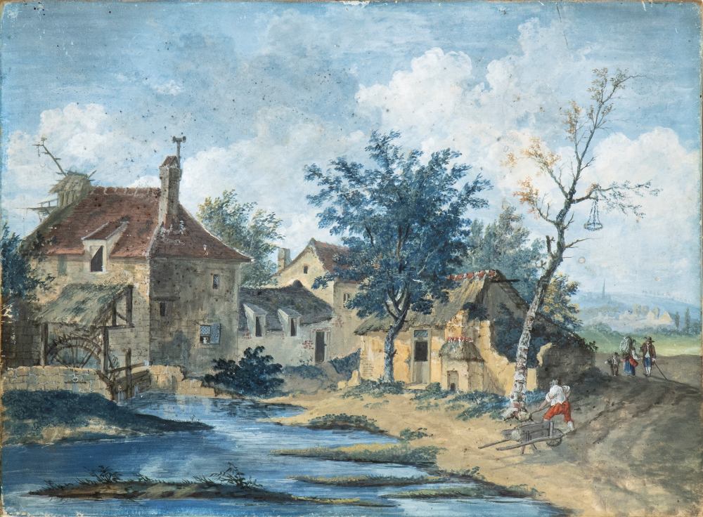 Artista nord-europeo, fine XVIII - XIX secolo Paesaggio con borgo, mulino,...