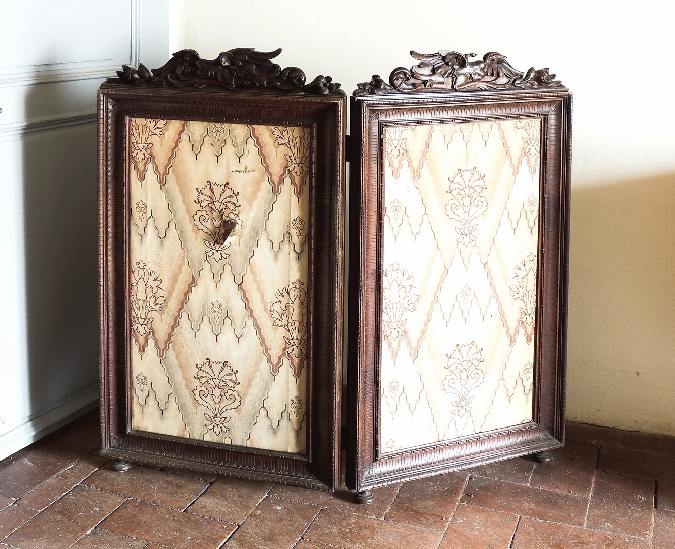 PICCOLO PARAVENTO A DUE ANTE IN NOCE fine del XIX secolo cimase intagliate con volatili e motivi floreali, pannelli in tessuto, difetti h cm 118x120