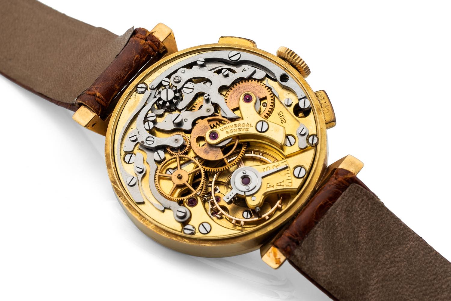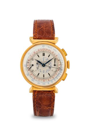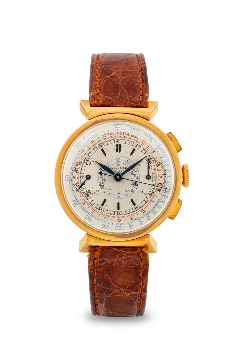 § UNIVERSAL GENÈVE Cronografo. Compur. Seriale 59XXXX. Movimento con calibro 285 a carica manuale. Cassa in oro 18kt con diametro da 35 mm. Dial bianco con doppio contatore, secondi al 9. Scala telemetrica e tachimetrica stampata all'estremità. Bracciale in pelle e fibbia ad ardiglione in acciaio non originale. Vetro plexiglas. 1930 ca. Orologio in discrete condizioni generali. Da notare le bellissime anse integrate. Al momento della catalogazione l’orologio risulta essere funzionante ma il movimento non è stato testato per la precisione del tempo.