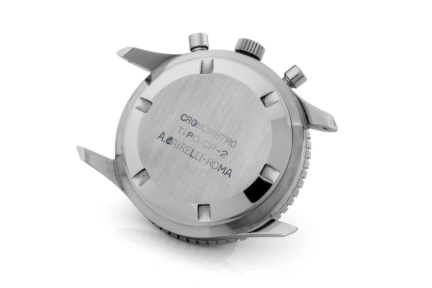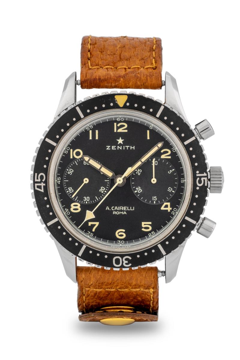 § ZENITH Cronografo CP-2 CAIRELLI ROMA. Movimento con calibro 146DP a carica manuale. Cassa in acciaio con diametro da 43 mm. Dial nero a due contatori con secondi al 9. Scritta "A. CAIRELLI ROMA" ad ore 6. Lunetta bidirezionale. Bracciale in cuoio con chiusura a bottone non originale. Fondello in acciaio a vite inciso esternamente. Vetro plexiglas. 1970 ca. Orologio RARO. Buone condizioni generali. Al momento della catalogazione l’orologio risulta essere funzionante ma il movimento non è stato testato per la precisione del tempo.