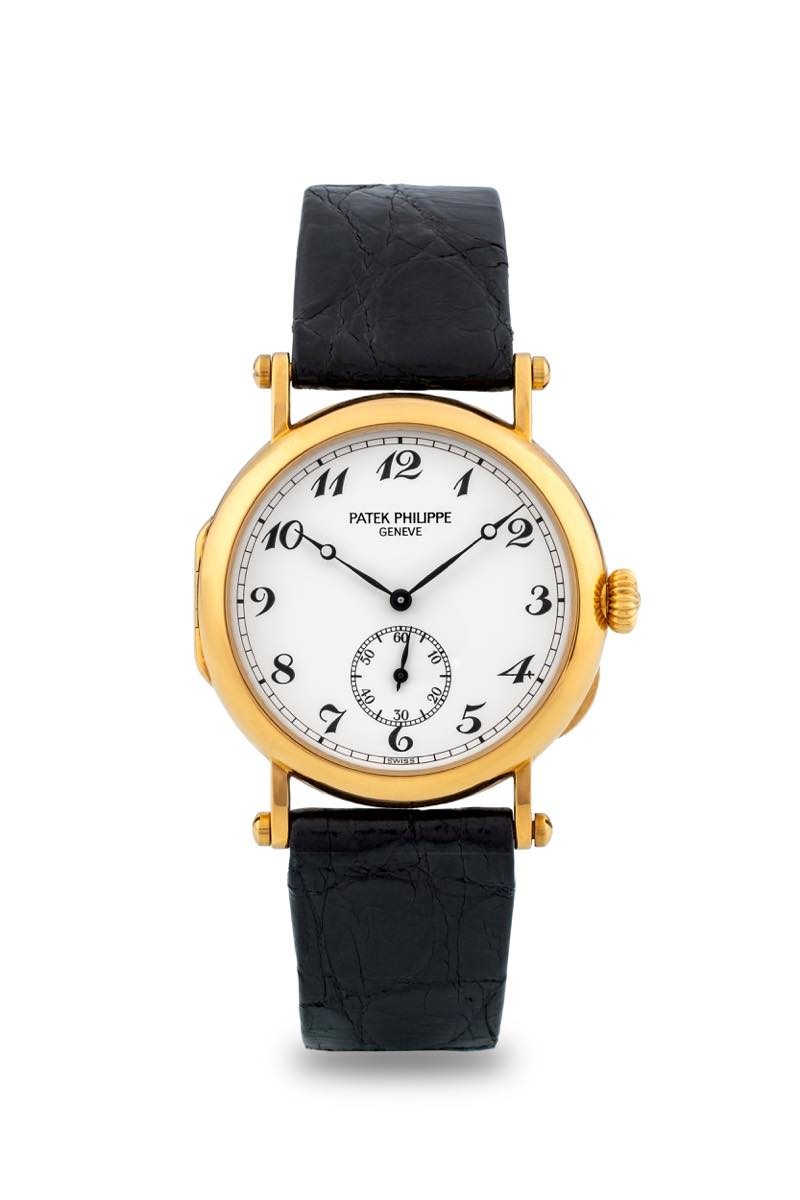 § PATEK PHILIPPE Calatrava. Referenza 3960J (150° anniversario 1839-1989). Seriale 28XXXX. Movimento 767815 con calibro 215 a carica manuale. Cassa in oro 18kt con diametro da 33 mm. Dial bianco in ceramica con grandi numeri arabi neri, secondi in piccolo al 6. Bracciale in pelle non originale con fibbia ad ardiglione originale in oro giallo 18kt. Doppio fondello con apertura a libro. Vetro minerale. 1990 ca. Orologio in buone condizioni generali. Al momento della catalogazione l’orologio risulta essere funzionante ma il movimento non è stato testato per la precisione del tempo.