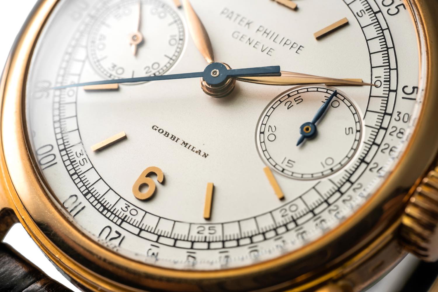 § PATEK PHILIPPE Chronograph - Gobbi Milan - ROSE GOLD. "TASTI TONDI" Referenza 1463. Numero di serie 6863XX. Movimento 8687XX con calibro 13-130CH a carica manuale. Cassa in oro ROSA 18kt (come si evince dall'estratto) con diametro da 35 mm. Dial Bianco a 2 contatori con indici e numeri arabi (6-12) in oro applicati. quadrante “GOBBI MILANO”. Funzione cronografo con tasti “tondi” in oro 18kt per settaggio e azionamento dello stesso. Ore, minuti e secondi del cronografo al centro. Bracciale in pelle originale con fibbia ad ardiglione in oro 18kt anch’essa originale. Fondello a vite in oro 18kt. Vetro Plexiglas. Orologio eccezionalmente conservato, lievi (e normali considerato l'anno di produzione) imperfezioni al dial, completo di estratto d'archivio che attesta la produzione di questo esemplare nel 1955 e la vendita effettuata nell'ottobre 1956. Funzionante. Orologio estremamente raro impreziosito dal quadrante “GOBBI MILANO” (storico concessionario di corso Vittorio Emanuele a Milano di Patek Philippe e di altri importantissimi brand dell’alta orologeria, chiuso solo recentemente) La referenza 1463 fu introdotta nel 1940, e rimase in produzione fino al 1965 circa. Fu il primo e unico cronografo Patek Philippe d'epoca impermeabile, grazie al fondello a vite e i pulsanti tondi a pompa (per i quali è stato soprannominato "Tasti Tondi" dai collezionisti italiani). Si stima una produzione totale di soli 700/750 esemplari di cui solo 140 in oro rosa come affermato da Christie's nel lotto 2475 dell'asta: "Important Watches, feauturing The Triazza Collection, Part I" del 27/11/2022. Ancora più rara, forse unica, la personalizzazione per Gobbi.