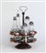 CRUET IN LEGNO EBANIZZATO di forma sagomata, tre sostegni torniti in avorio, cinque ampolle in cristallo molato