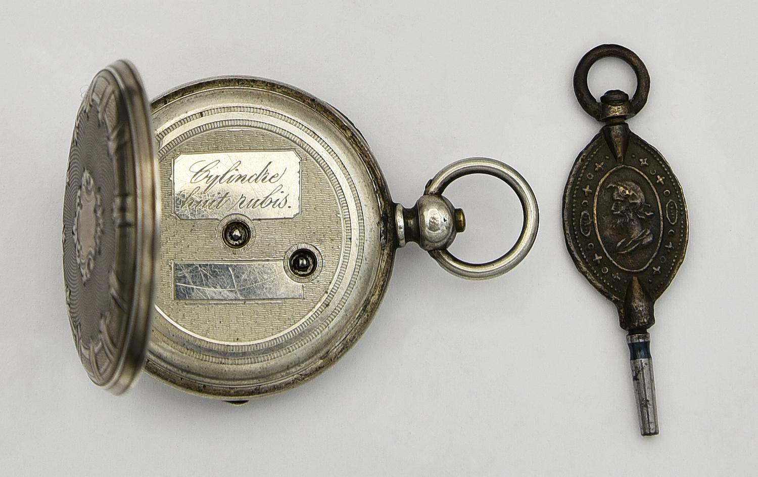 CASSA: in argento con doppio fondello, lavorata sul retro a sbalzo e incisione; numero di cassa e punzone dell'argento (granchio) visibili sulla superficie interna di entrambi i fondelli; sulla superficie esterna del fondello piu' interno inciso: "Cylindre/huit rubis"