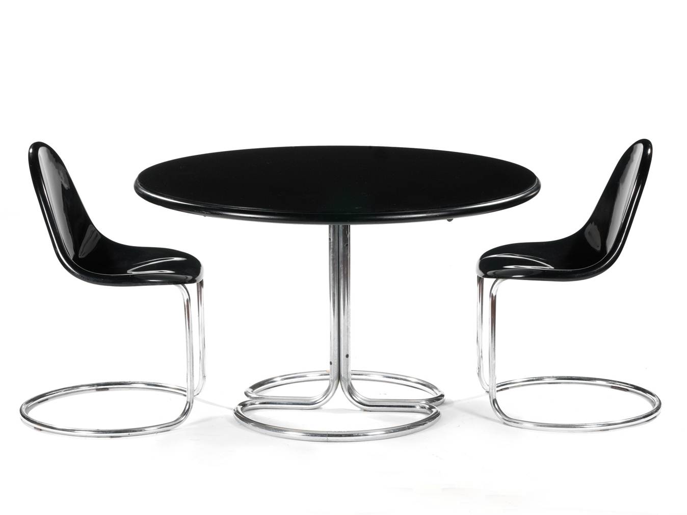 Giotto Stoppino (Vigevano, 1926 - Milano, 2011) Due sedie E TAVO LO Maia Produzione: Bernini, 1969 Sedie: struttura in tubolare di acciaio, sedile in Abs. Tavolo: struttura in tubolare di acciaio, piano in legno laccato sedie: cm 81 h x 49 x 54 tavolo: cm 70 h x 120 diametro