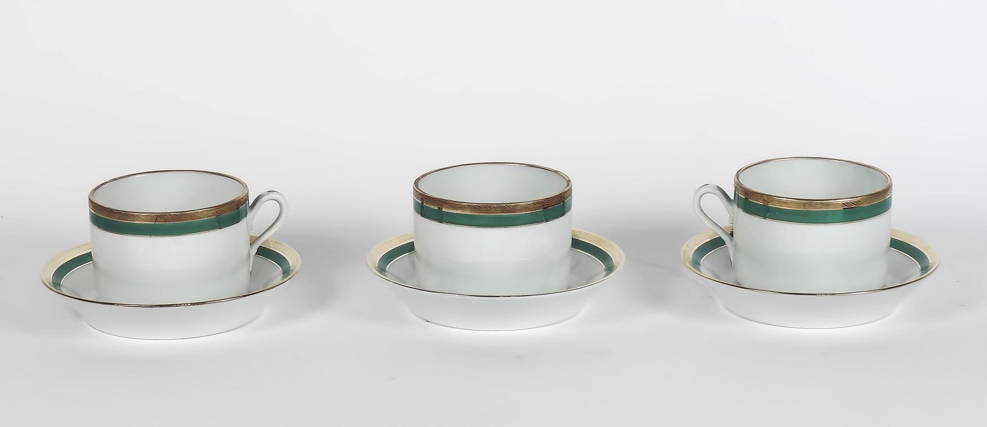 SERIE DI SEI TAZZE DA TE IN PORCELLANA Ginori Manifattura di Doccia in stile impero, bordi nei toni del verde e dell'oro, corredate di piattino