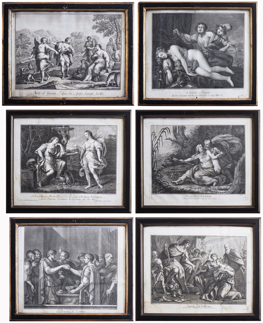 RACCOLTA DI INCISIONI XVIII secolo raffiguranti scene mitologiche e storiche, tra cui alcune di Giovanni B. Cecchi, in cornici ebanizzate e in parte dorate (6)