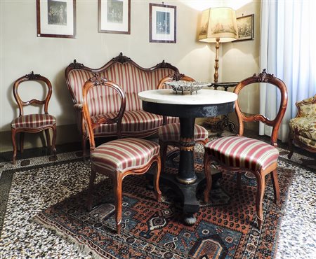 TAVOLINO ROTONDO IN LEGNO EBANIZZATO inizio del XIX secolo piano in marmo...