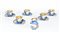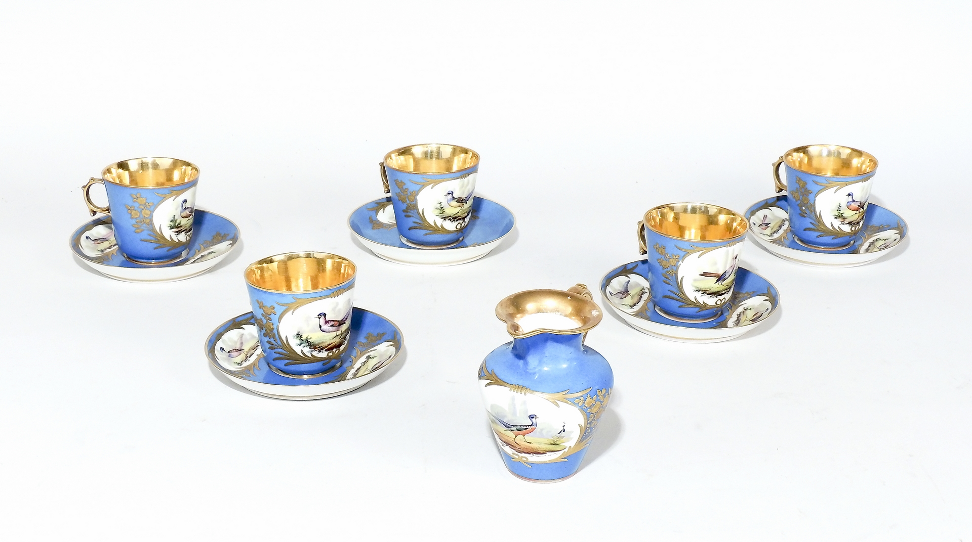 SERIE DI CINQUE TAZZINE DA CAFFÈ IN PORCELLANA Francia, metà del XIX secolo dipinte con volatili policromi entro riserve su fondo turchese, interno dorato, corredate di piattini e lattiera(6)
