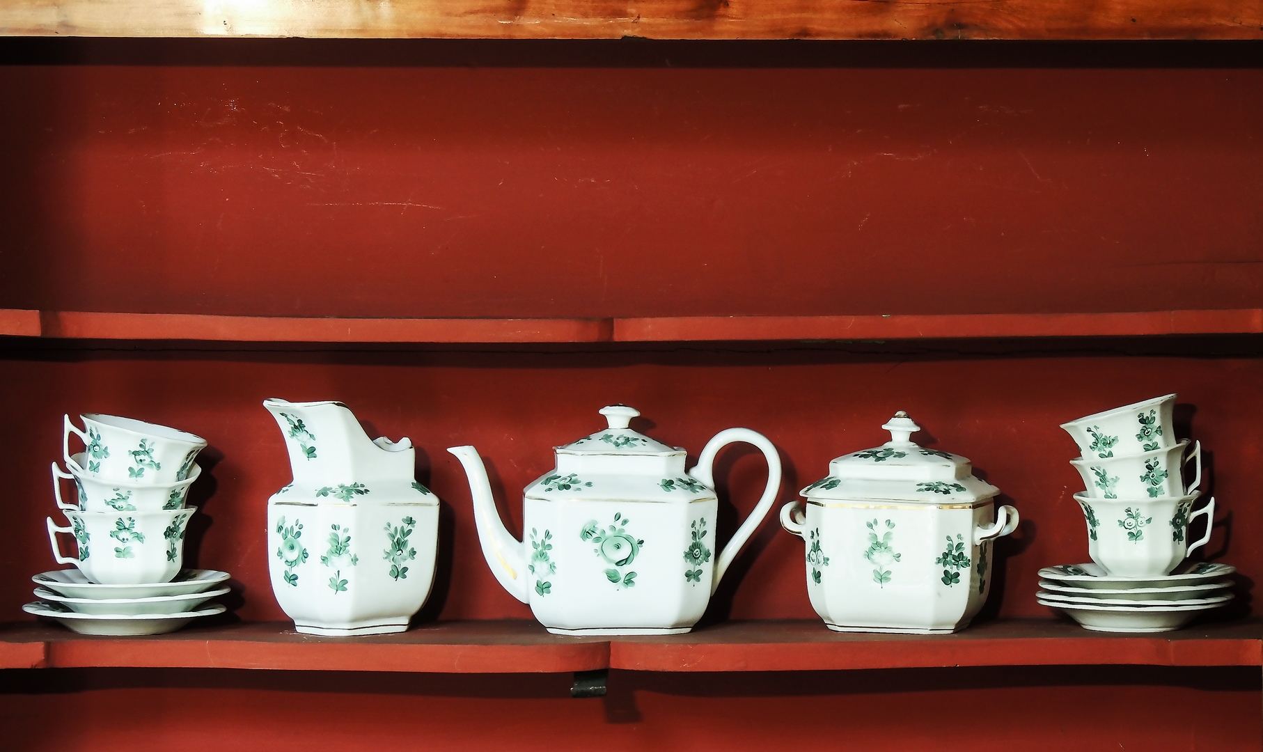 SERVITO DA TE IN PORCELLANA Ginori, seconda metà del XIX secolo dipinto con motivi floreali nei toni del verde e lumeggiature in oro, completo per sei persone, composto da sei tazze con piattino, teiera, lattiera e zuccheriera, difetti (9)