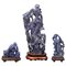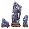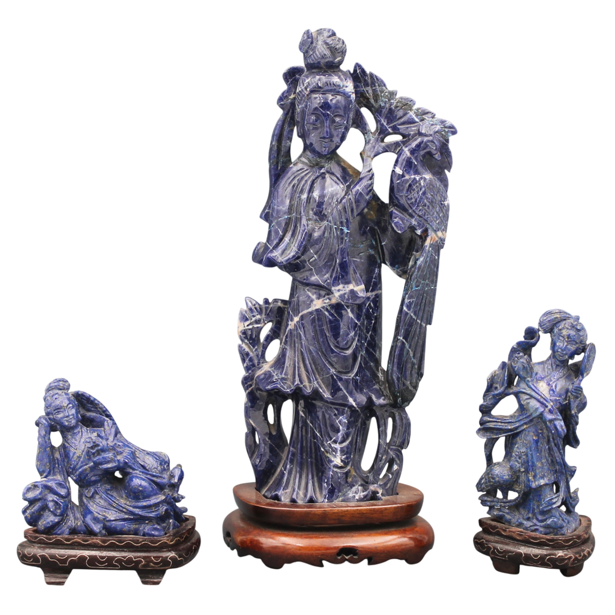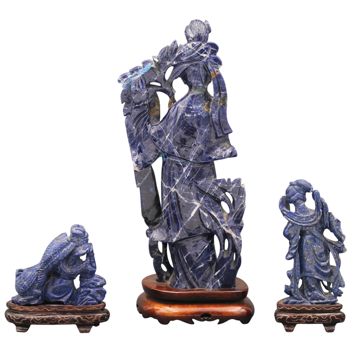 Figure orientali Lotto di tre statue in lapislazzuli su basi in teak (rotture...