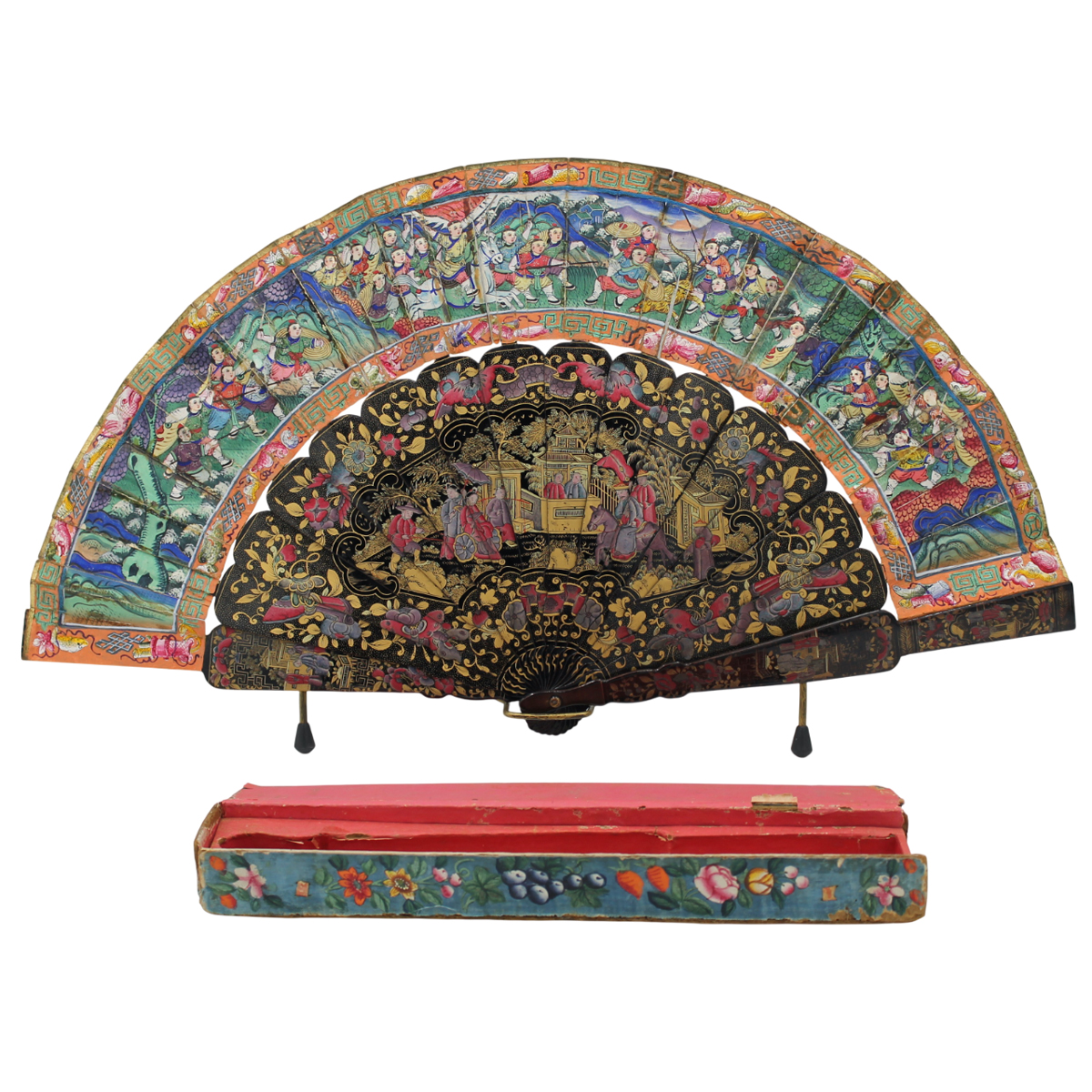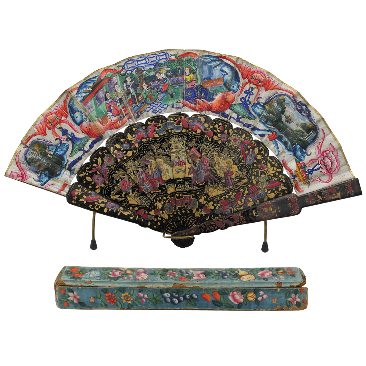 Ventaglio Decorazioni orientali dipinte su carta in entrambe le facce con stecche in papie mache decorato (danni). Lotto dotato di custodia decorata. Cm 30x52