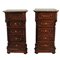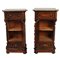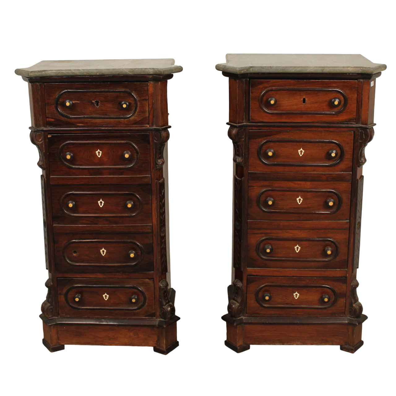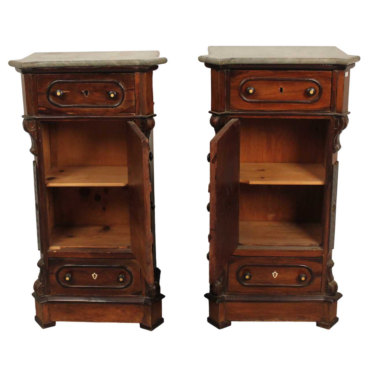 Coppia di comodini Palissandro con sportello e due cassetti nella parte centrale (lievi mancanze). Laterali intagliati e piano in marmo grigio. Sicilia. Secolo XIX. Cm 52x31 h 93