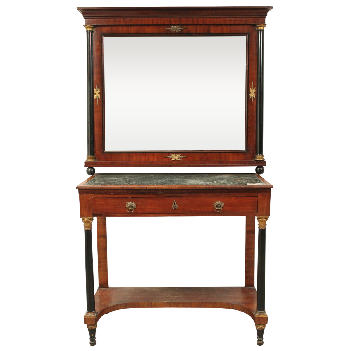 Consolle con specchiera Mogano con colonne laterali scolpite e capitelli dorati. Piano in marmo verde delle alpi incassa. Sicilia. Fine secolo XIX. Cm 109x55 h 96 (consolle); cm 121x105 (specchiera)