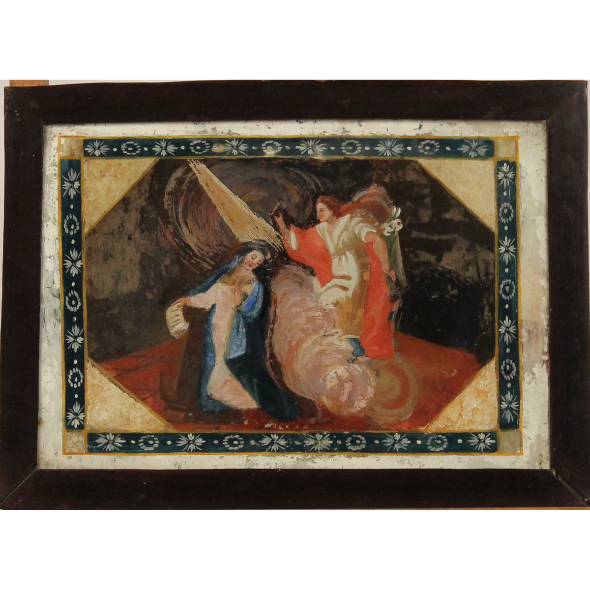 Scuola siciliana della fine del secolo XVIII "Scena sacra" Dipinto ad olio su vetro in cornice in mogano. Cm 30x42