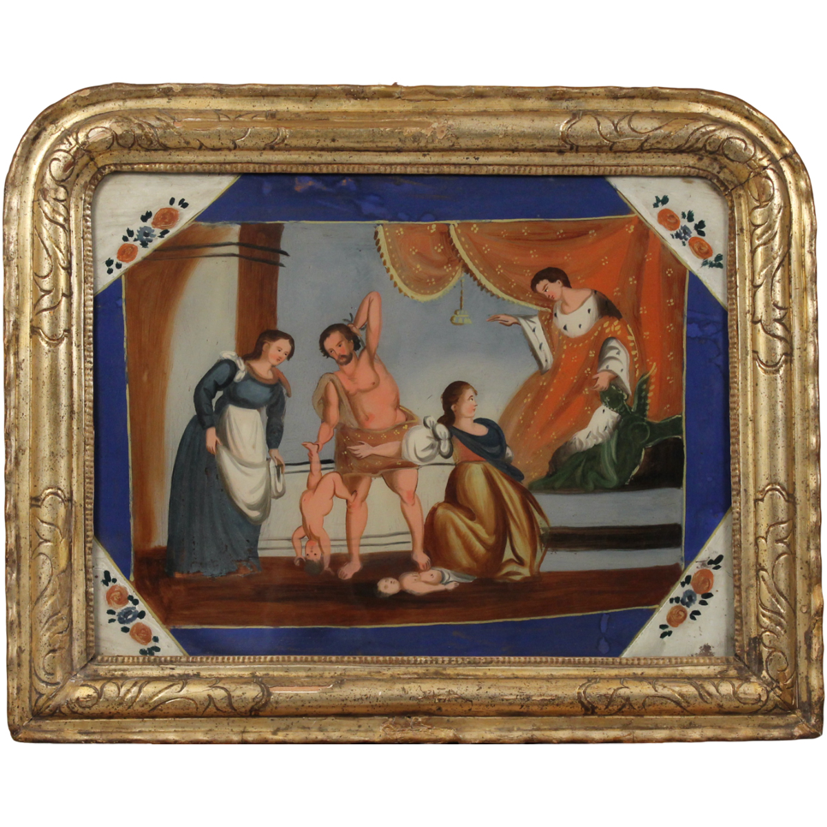 Scuola siciliana della fine del secolo XVIII "La strage degli innocenti" Dipinto ad olio su vetro in cornice in legno inciso e dorato. Cm 46x61