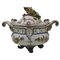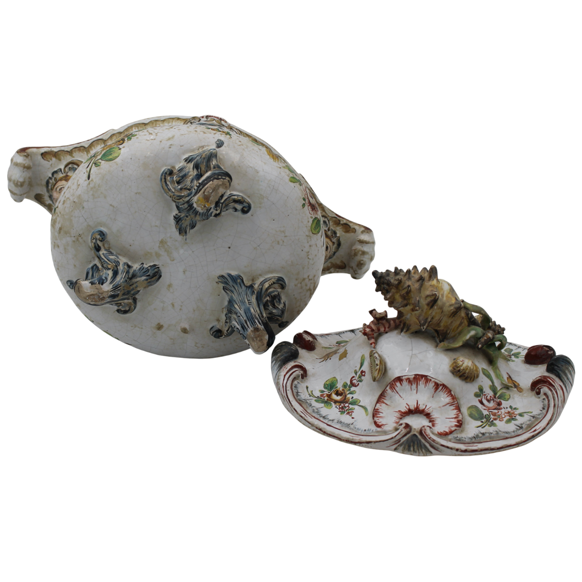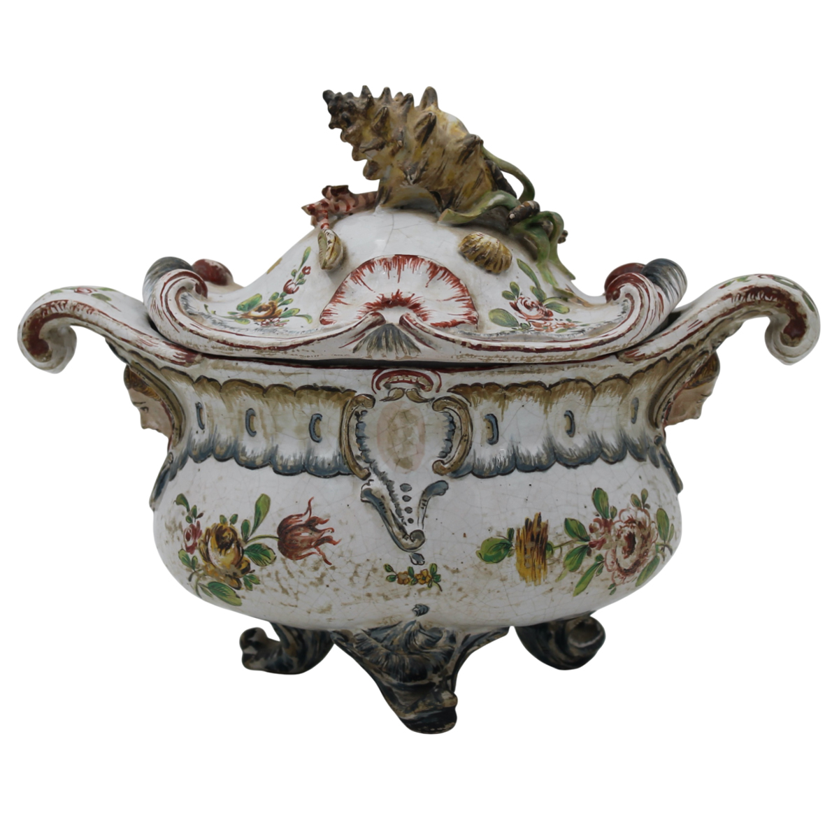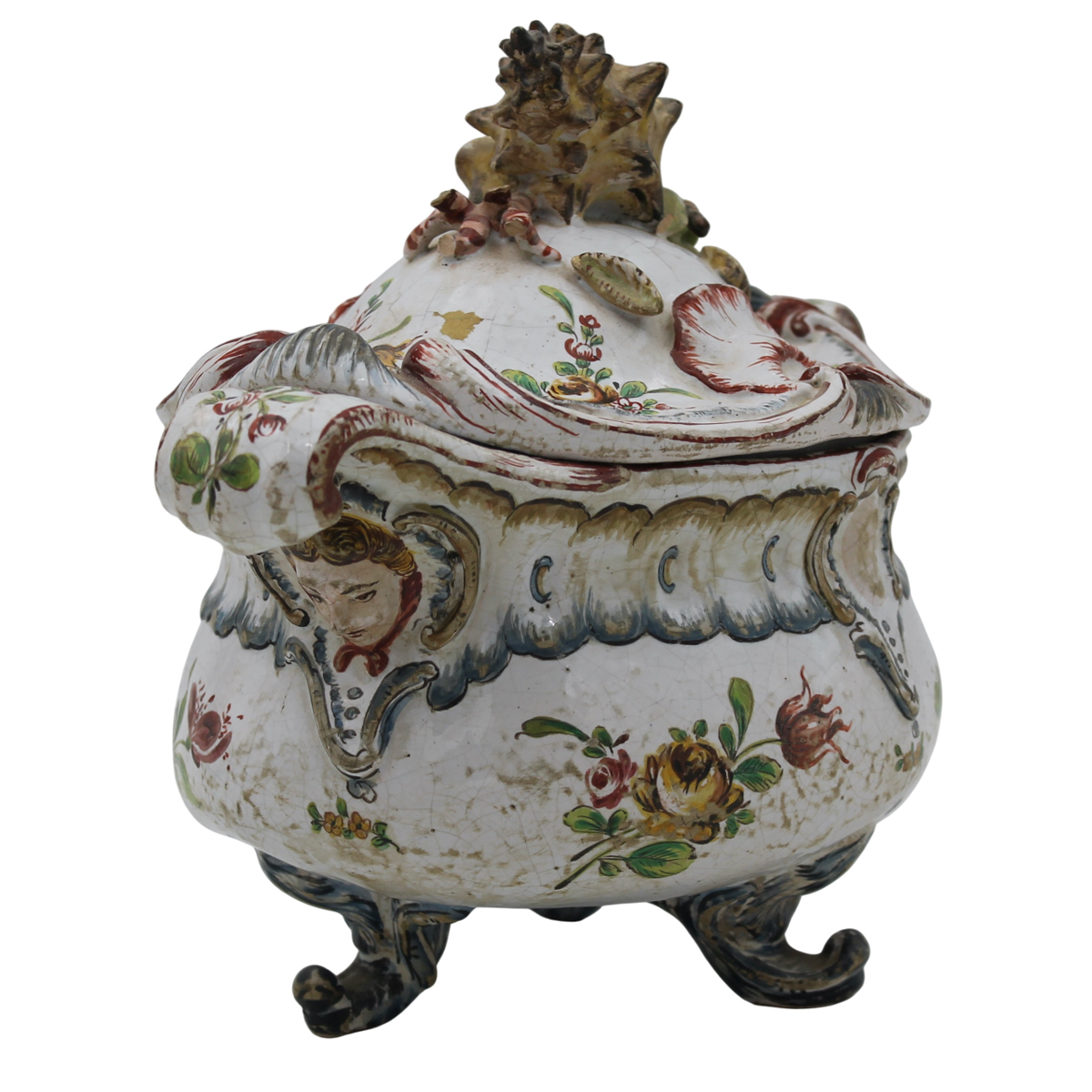 Particolare zuppiera Ceramica decorata a motivi floreali policromi con mascheroni sui laterali e molluschi nella parte superiore. Lombardia. Inizi secolo XIX. Cm 25x32