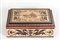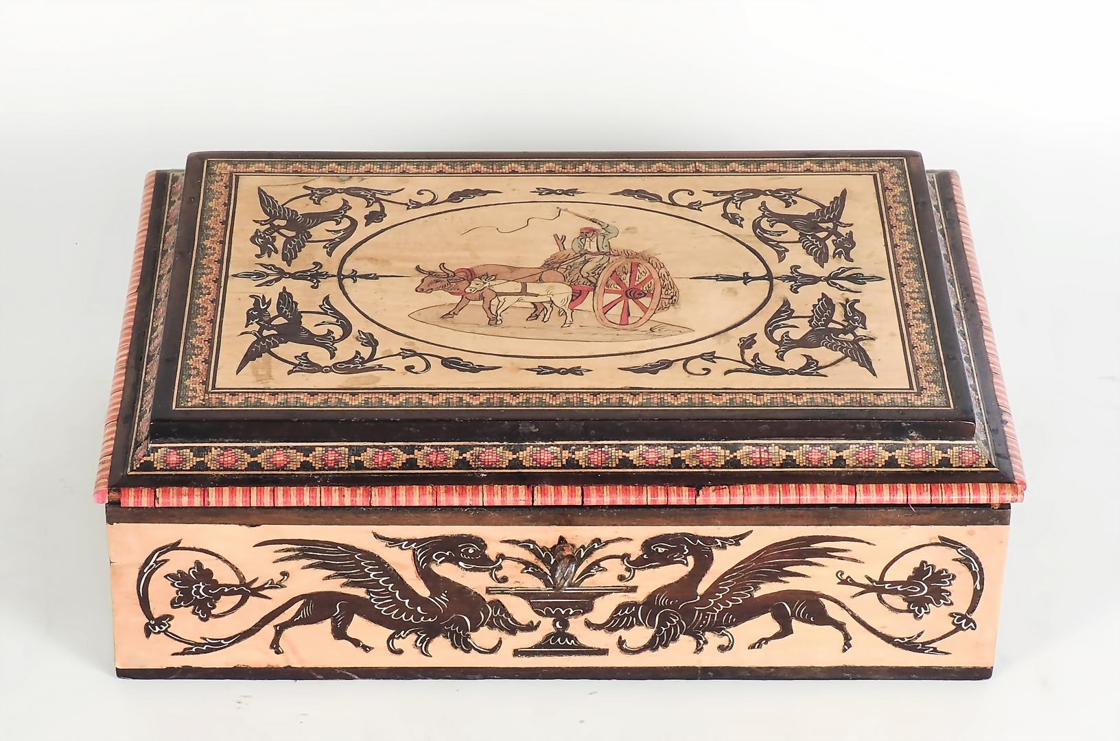 SCATOLA IN NOCE Sorrento, inizio del XX secolo intarsiata e pirografata in legni di frutto con grottesche e scena campestre, impreziosita da bordure in micromosaico di paglia