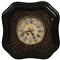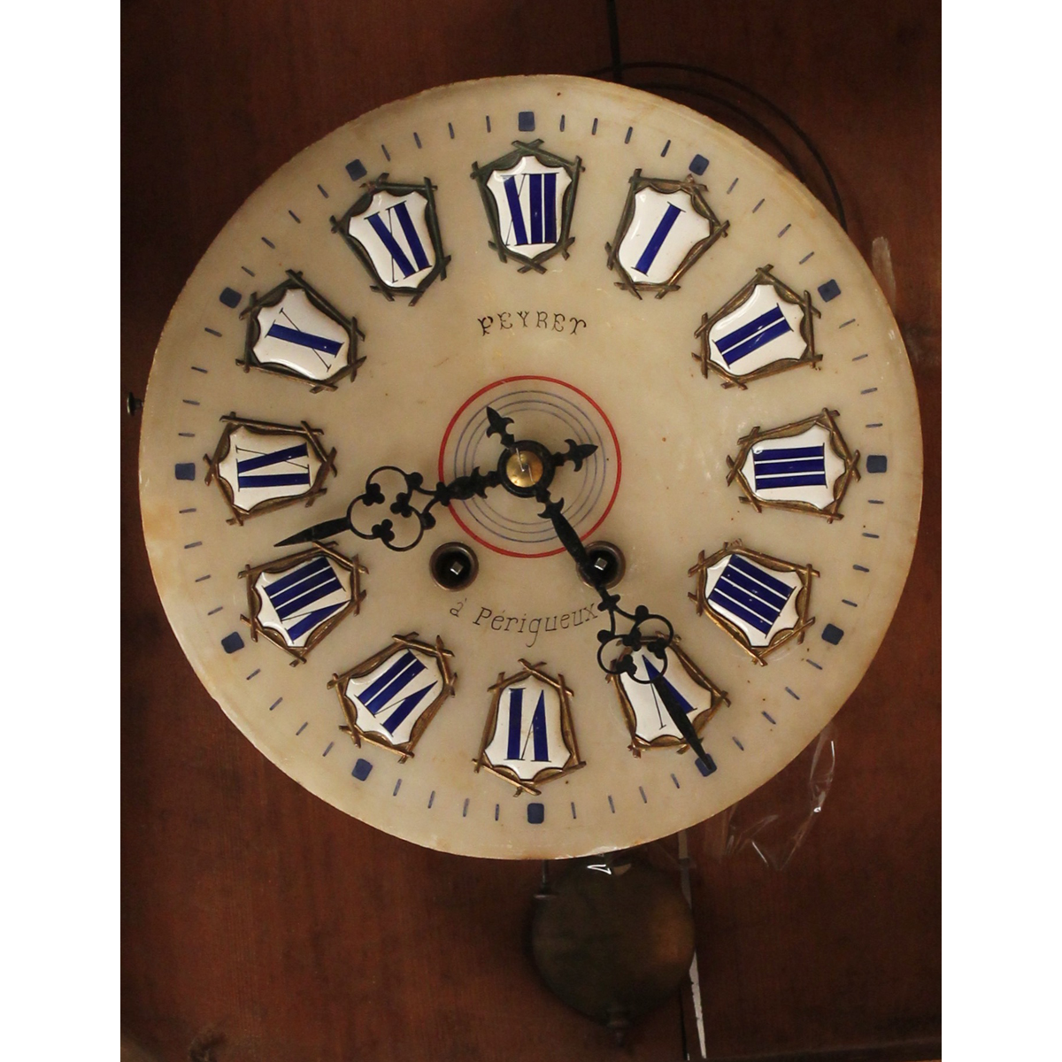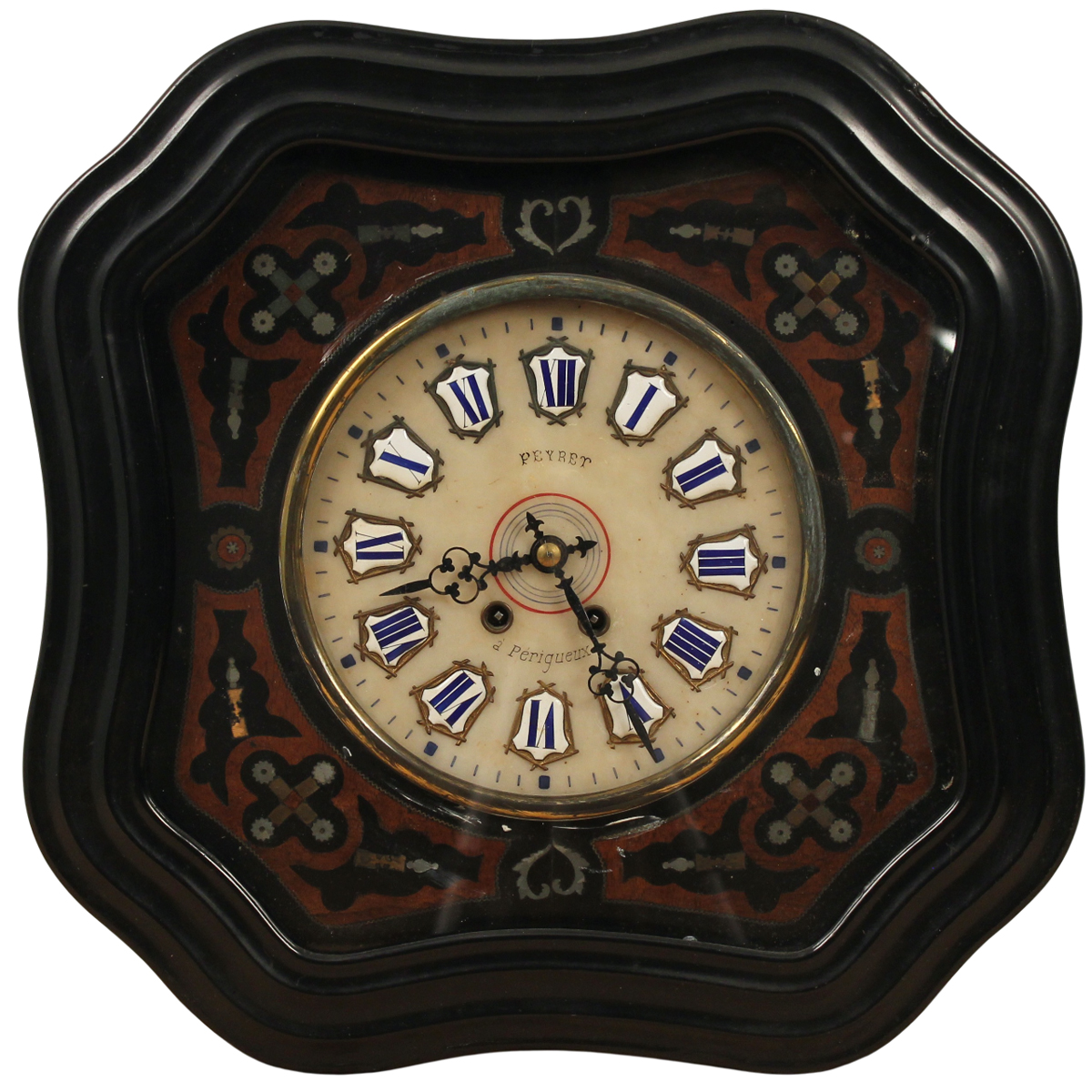 Orologio da parete Quadrante in alabastro e cassa in legno intarsiato con applicazioni di rame e madreperla. Marcato Peyret. Fine secolo XIX. Cm 50x50