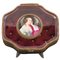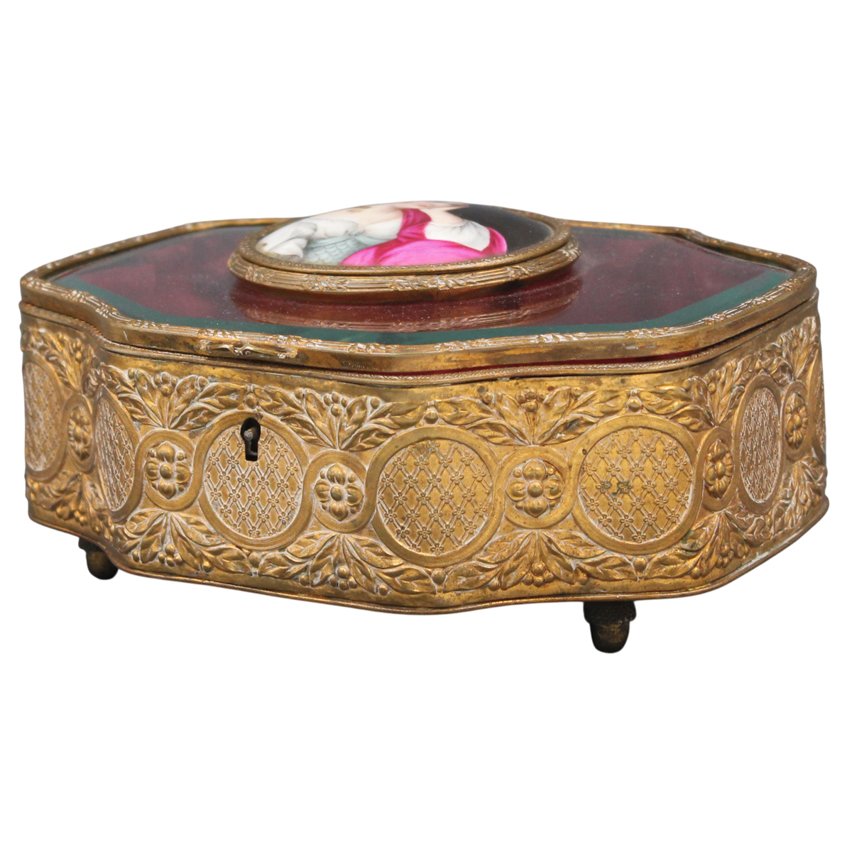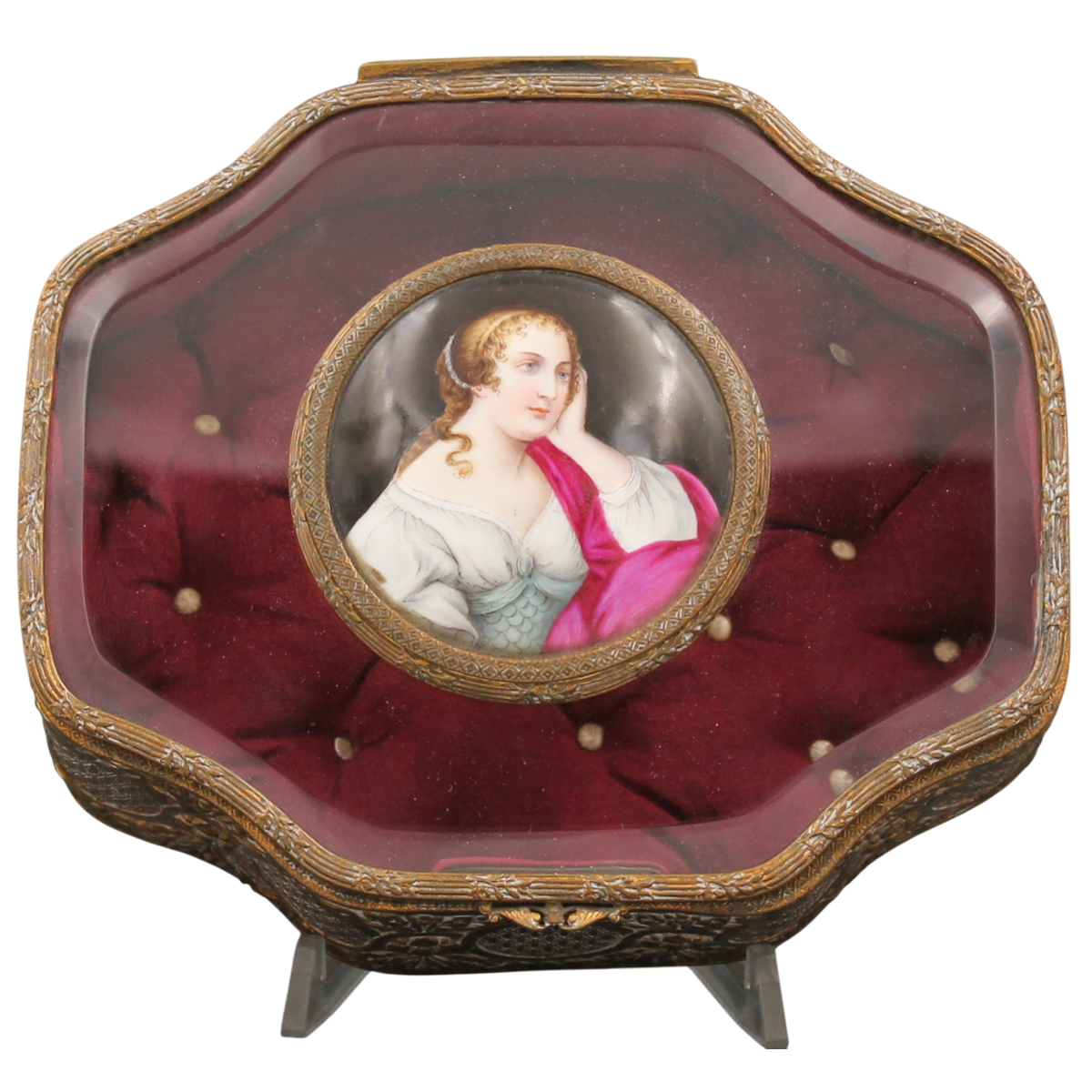Scatola porta gioie Rame dorato inciso a motivi ornamentali e placca in porcellana con figura femminile sul coperchio. Francia. Seconda metà del secolo XIX. Cm 19x17 h8